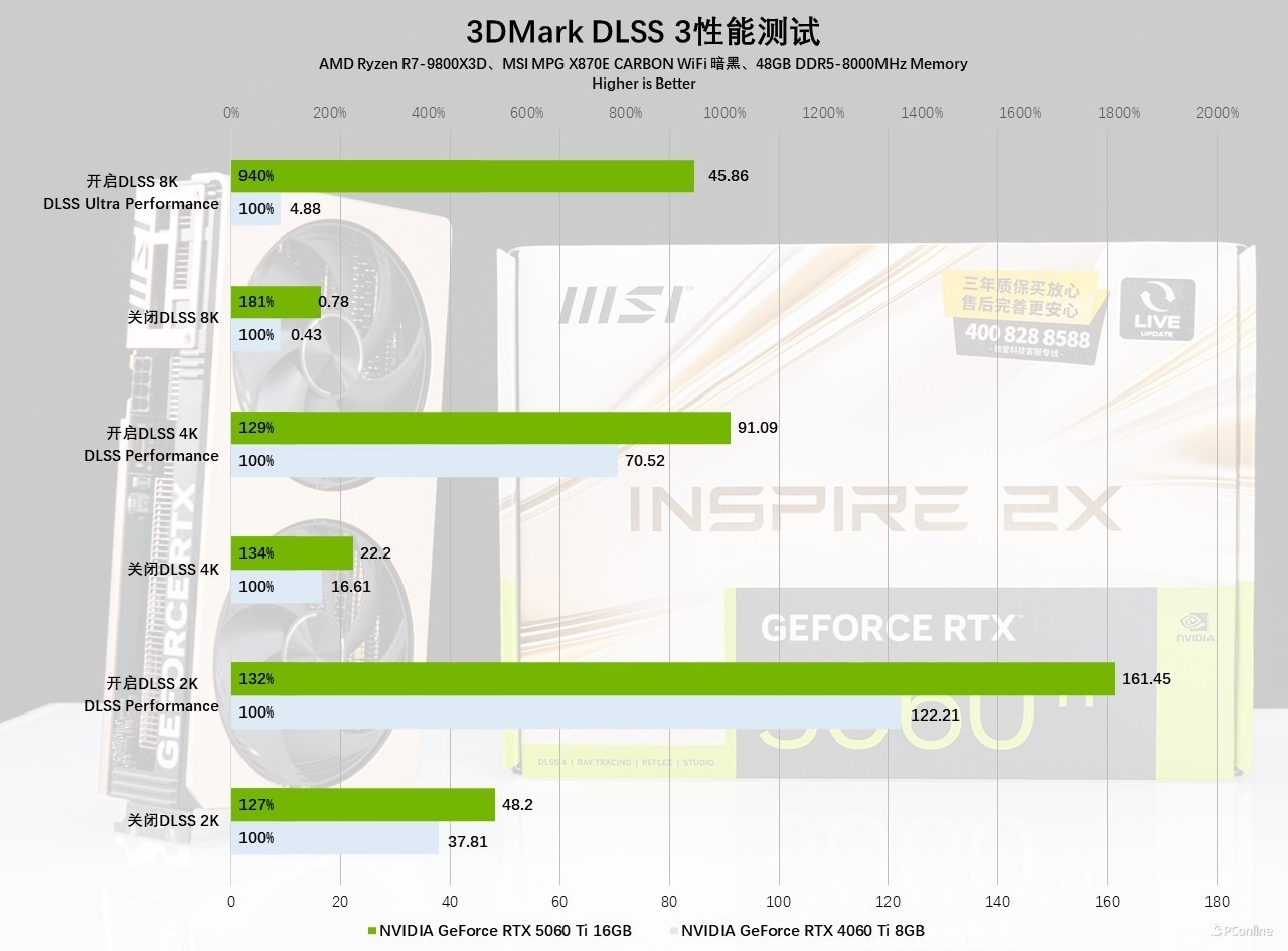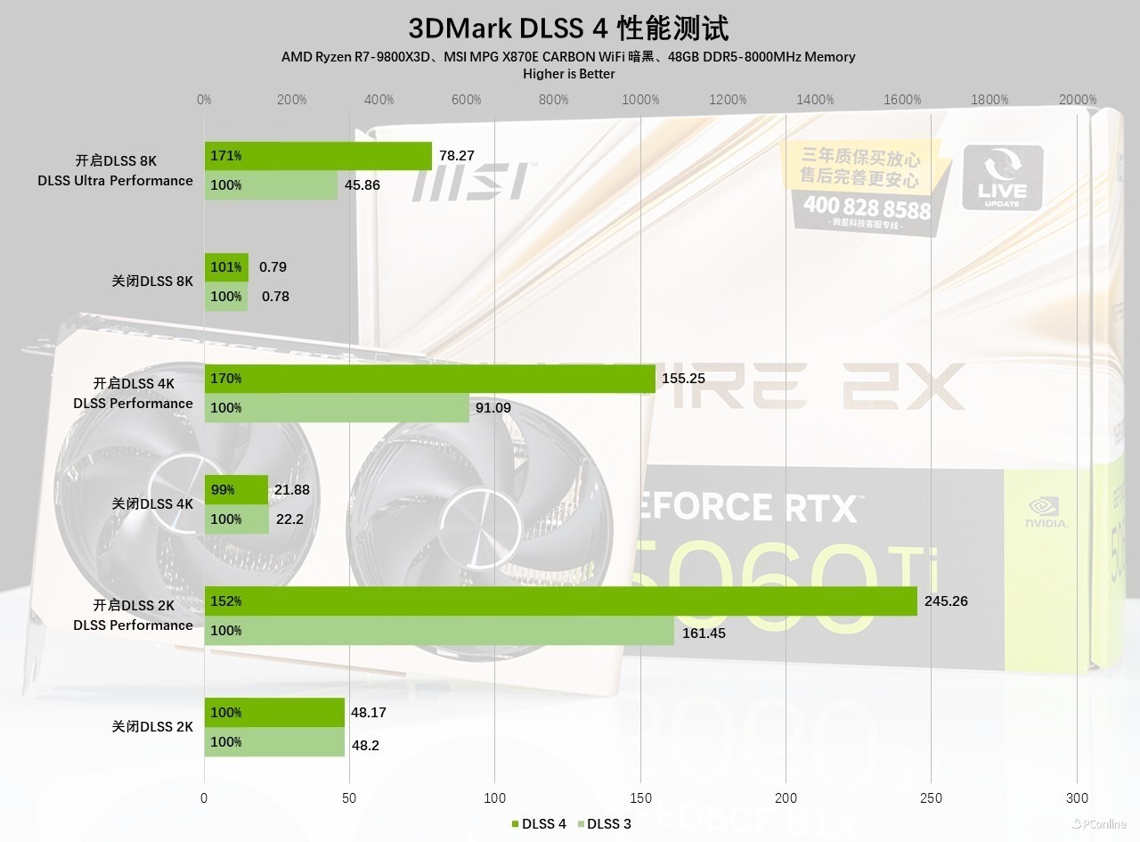 简单介绍完,我们再看看DLSS 4的理论表现如何,还是经典的3DMark测试。不得不说微星GeForce RTX 5060 Ti INSPIRE 2X 硬派师16GB搭配上DLSS 4后,帧数就跟打了鸡血一样,开关前后的性能简直天壤之别!其中2K分辨率下,开关前后性能差距足足有4倍之多。4K分辨率时帧数差距直接就是7倍。最离谱的还要属8K, 微星GeForce RTX 5060 Ti INSPIRE 2X 硬派师16GB在DLSS 4加持下可以做到78 FPS,要知道在DLSS 3下,这款显卡几乎不可能实现8K,或许以后甜品卡也能畅享8K游戏也说不定。