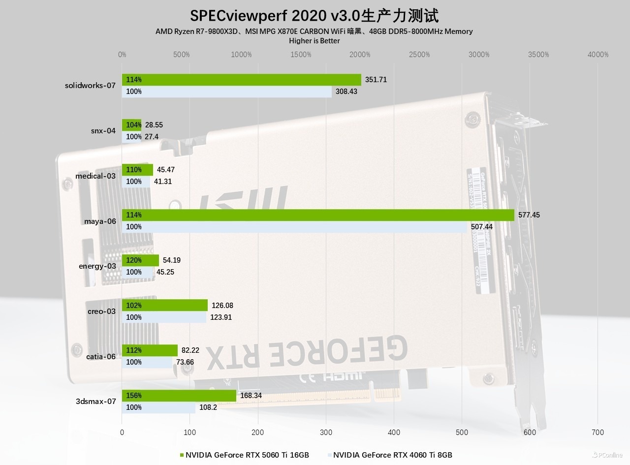 工业领域我们用的是SPEC2020进行测试,它能够反应显卡的整体工业能力,在多项测试中微星GeForce RTX 5060 Ti INSPIRE 2X 硬派师16GB对比RTX 4060 Ti平均有15-20%的提升,部分项目领先幅度更高,例如3dsmax-07中,微星GeForce RTX 5060 Ti INSPIRE 2X 硬派师16GB的表现比前代高了56%!