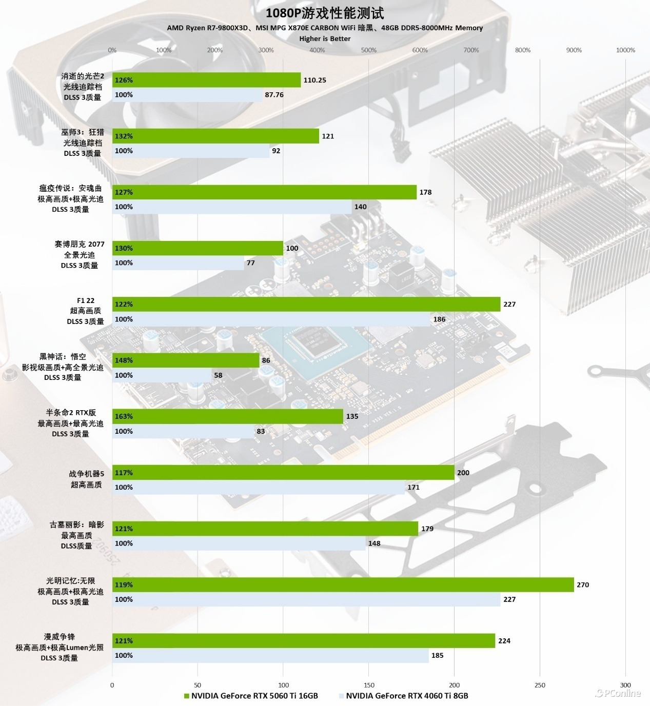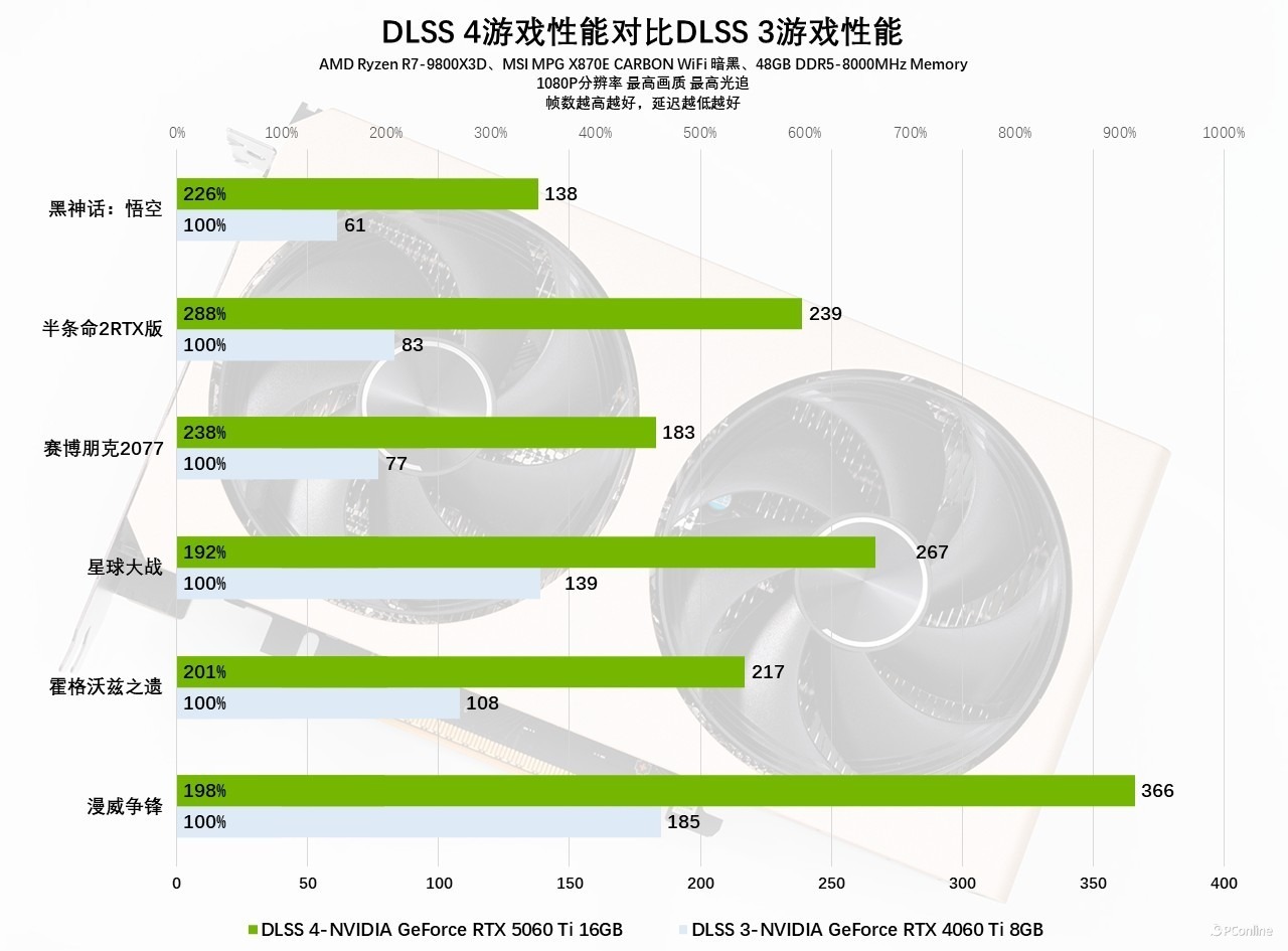 性能方面同样带给不少玩家惊喜,实测微星GeForce RTX 5060 Ti INSPIRE 2X 硬派师16GB在绝大部分3A游戏中,性能相比上一代的RTX 4060 Ti提升明显,1080P下强约20-30%左右,部分游戏在仅DLSS 3的加持下就有200+ FPS的出色表现。而在DLSS 4技术的加持下,这款显卡则更显出众,与上代显卡的性能差距甚至可以用倍数去衡量,非常夸张。