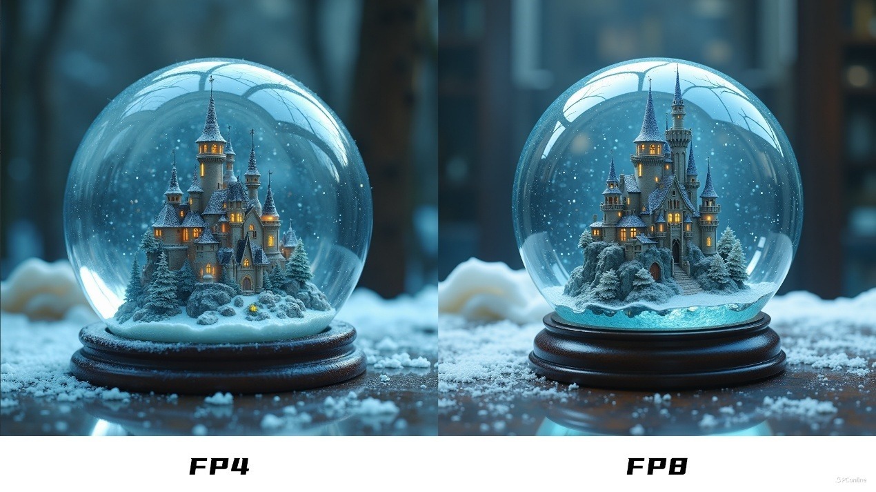 新显卡引入的FP4精度模型除了流畅之外, FP4精度模型生成的图片也非常能打,从下图就能看出来,其与FP8生成的图片几乎没有区别,无论是对关键词的理解还是图像的质量,都非常有保障。