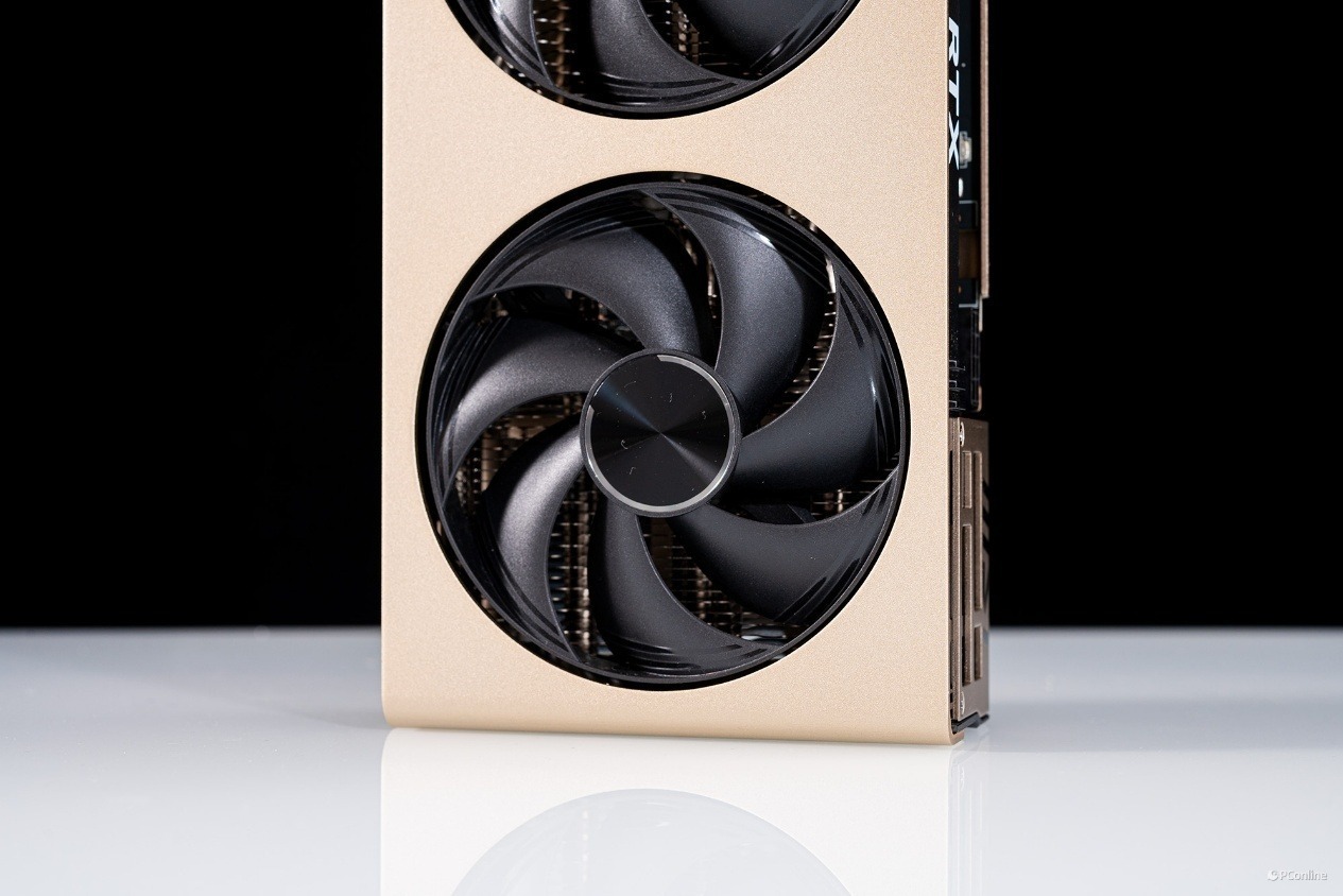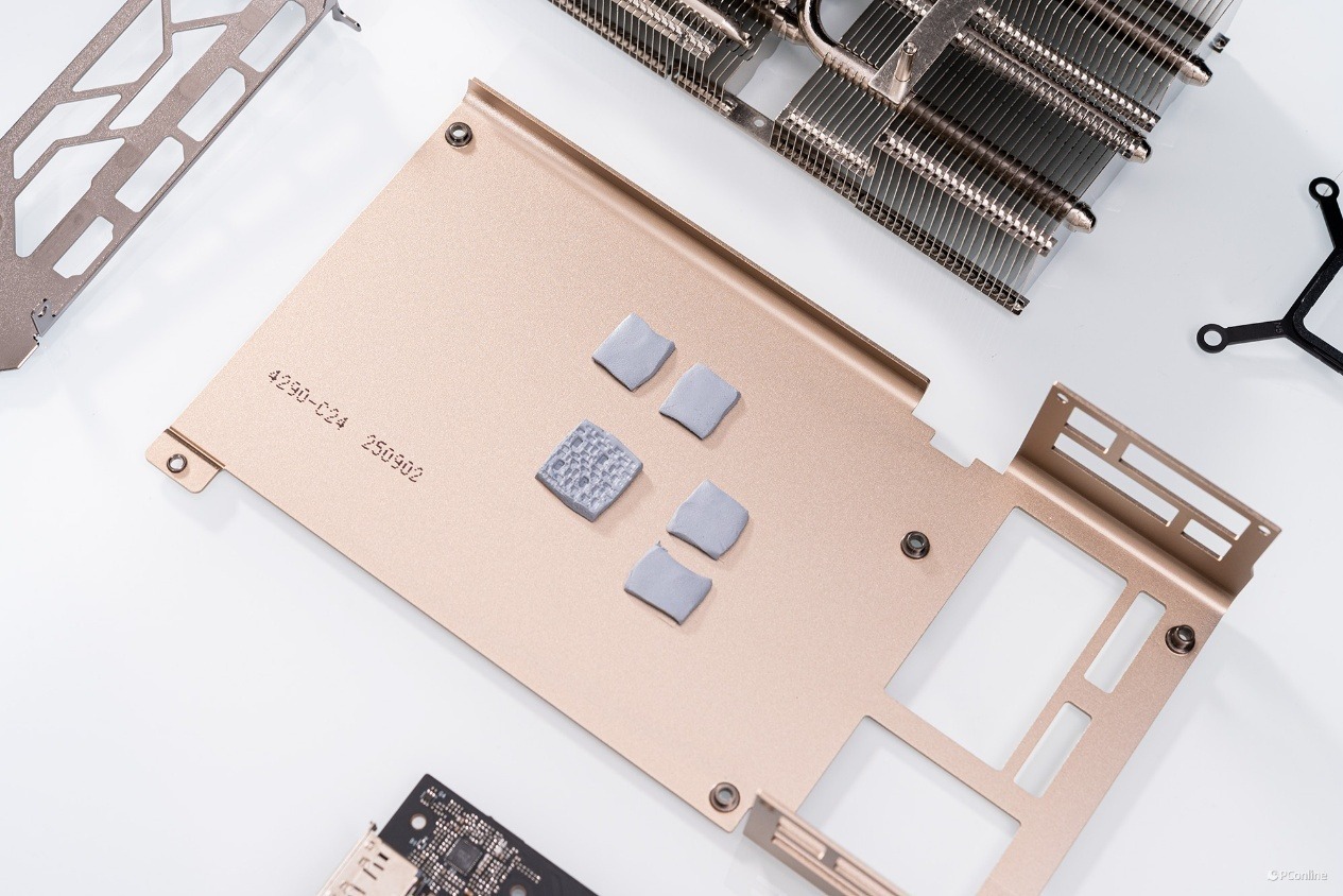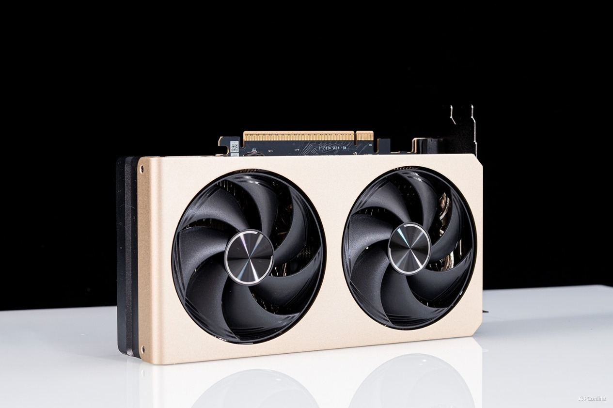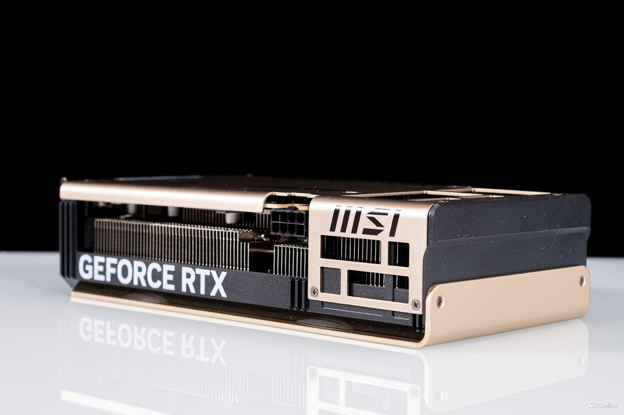 翻转视角看看显卡的背部,其背板采用全金属打造,同时延续了正面香槟金的配色。在不同的光线下,显卡背部会呈现不同的视觉效果,造就了低调的精致感。