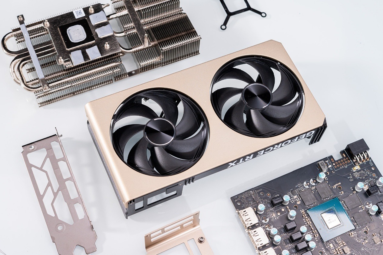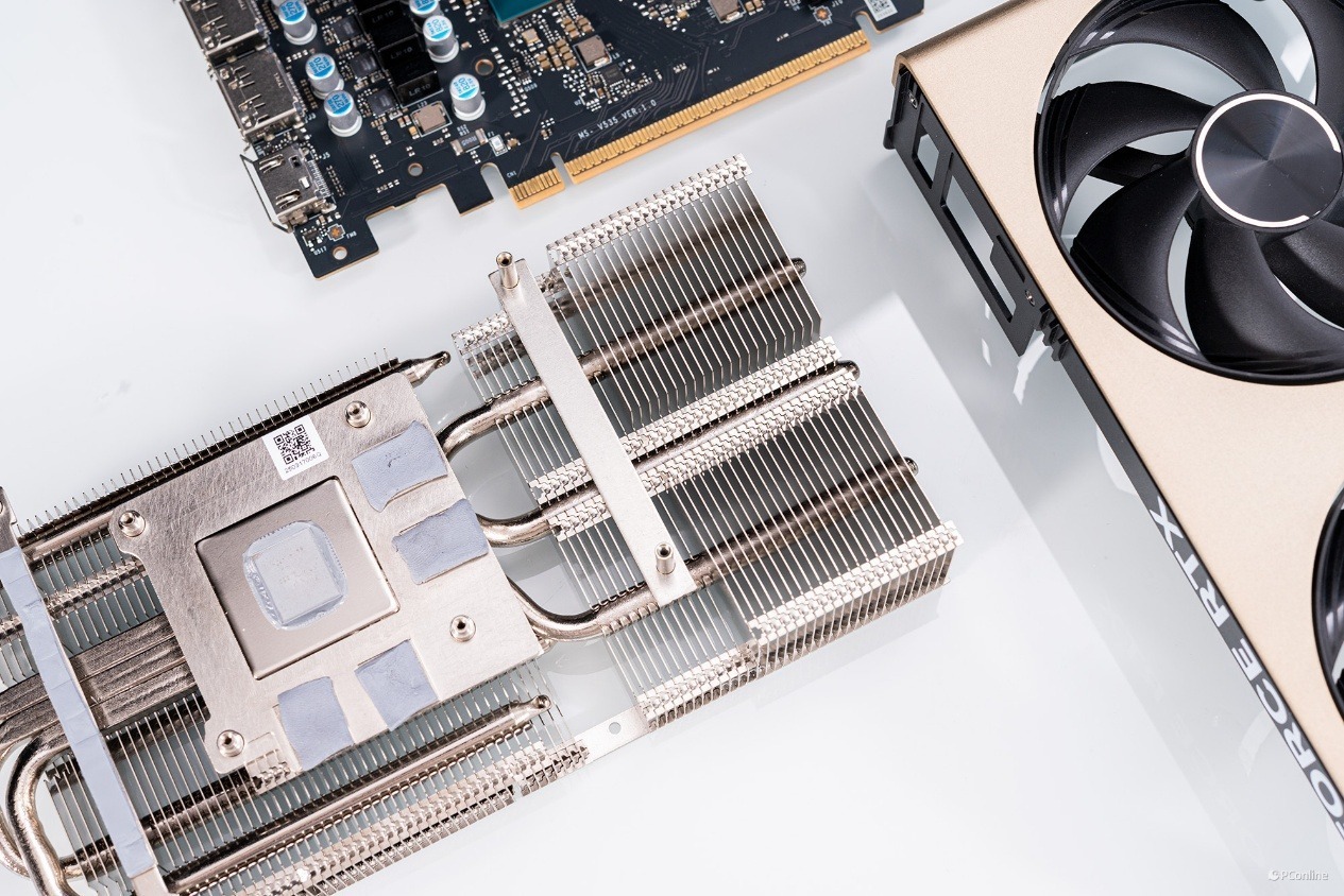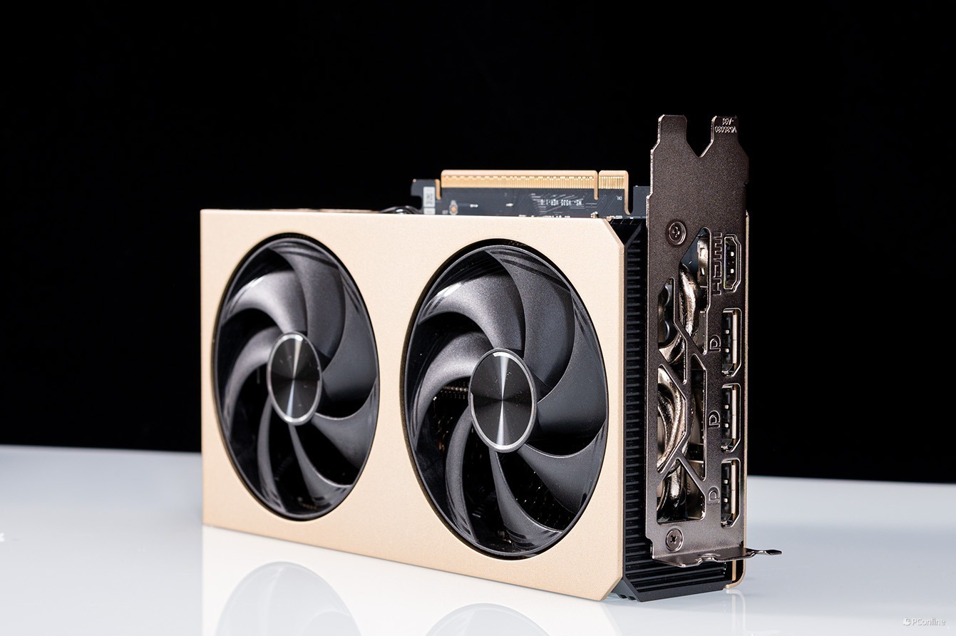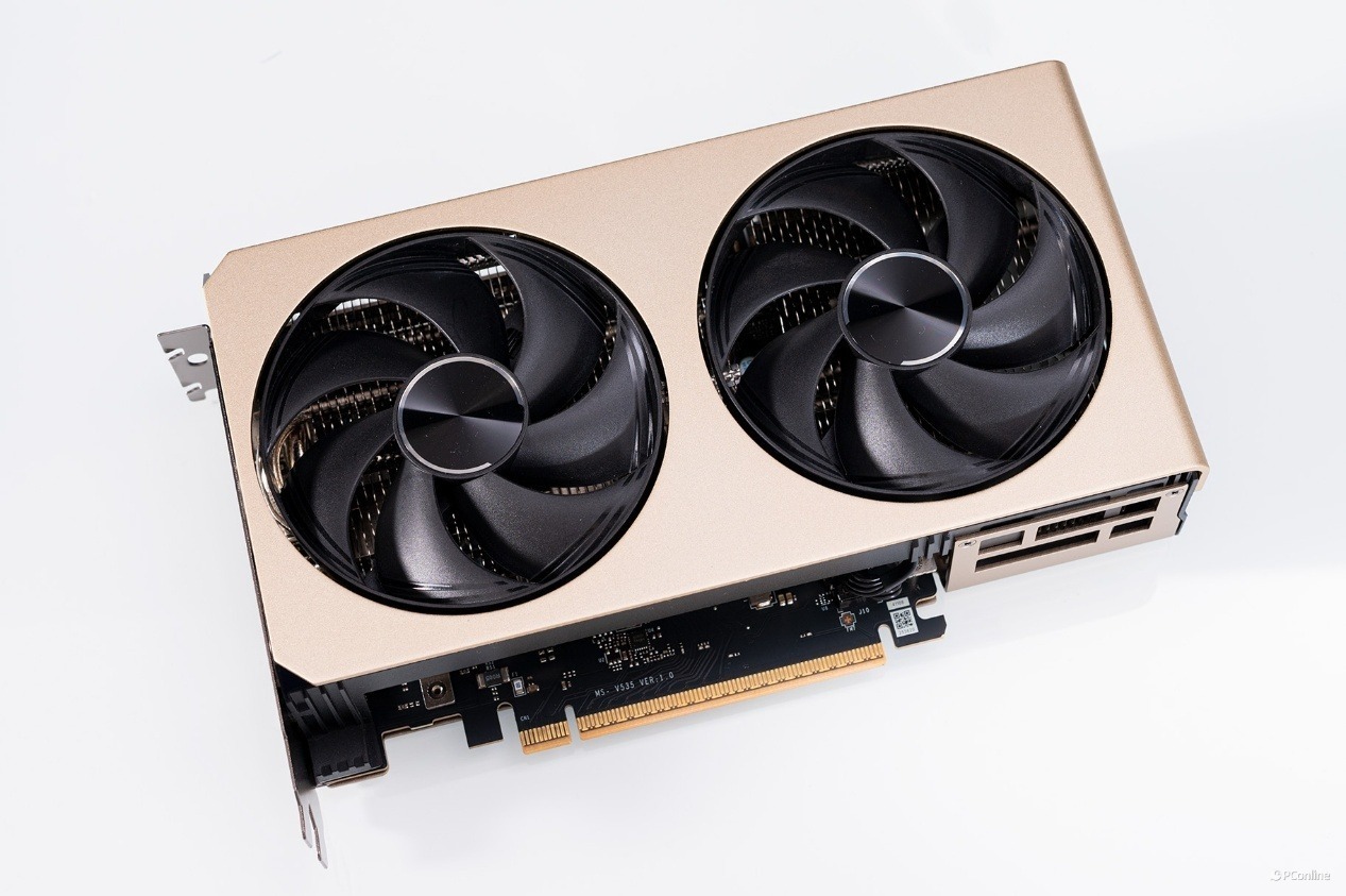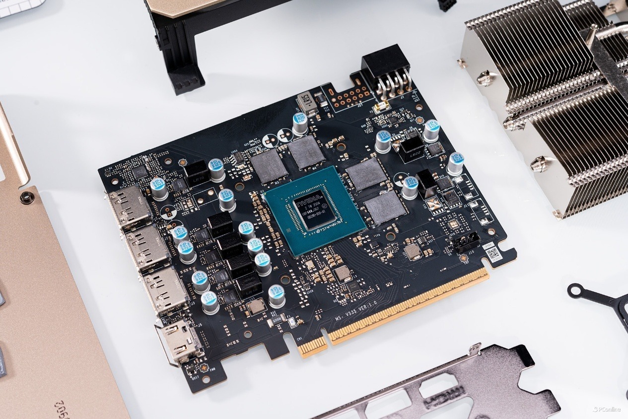 翻转视角看看显卡的背部,其背板采用全金属打造,同时延续了正面香槟金的配色。在不同的光线下,显卡背部会呈现不同的视觉效果,造就了低调的精致感。