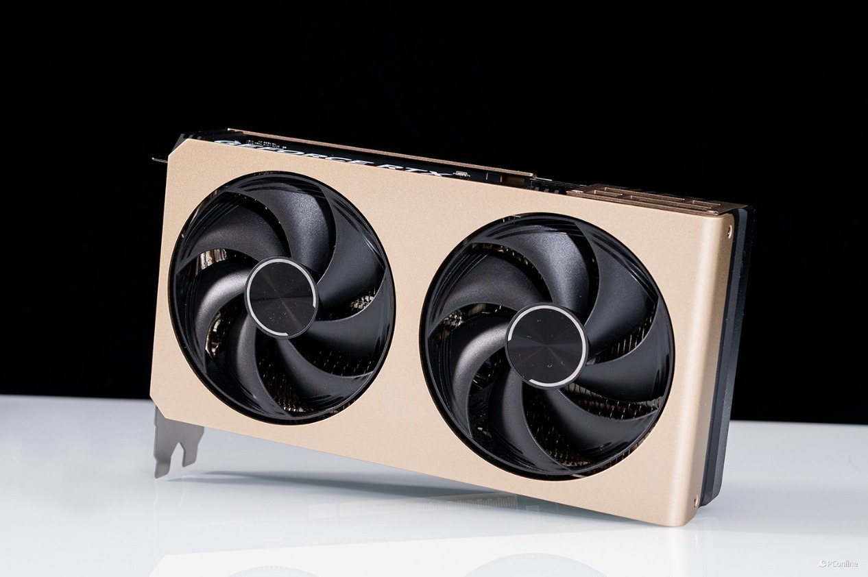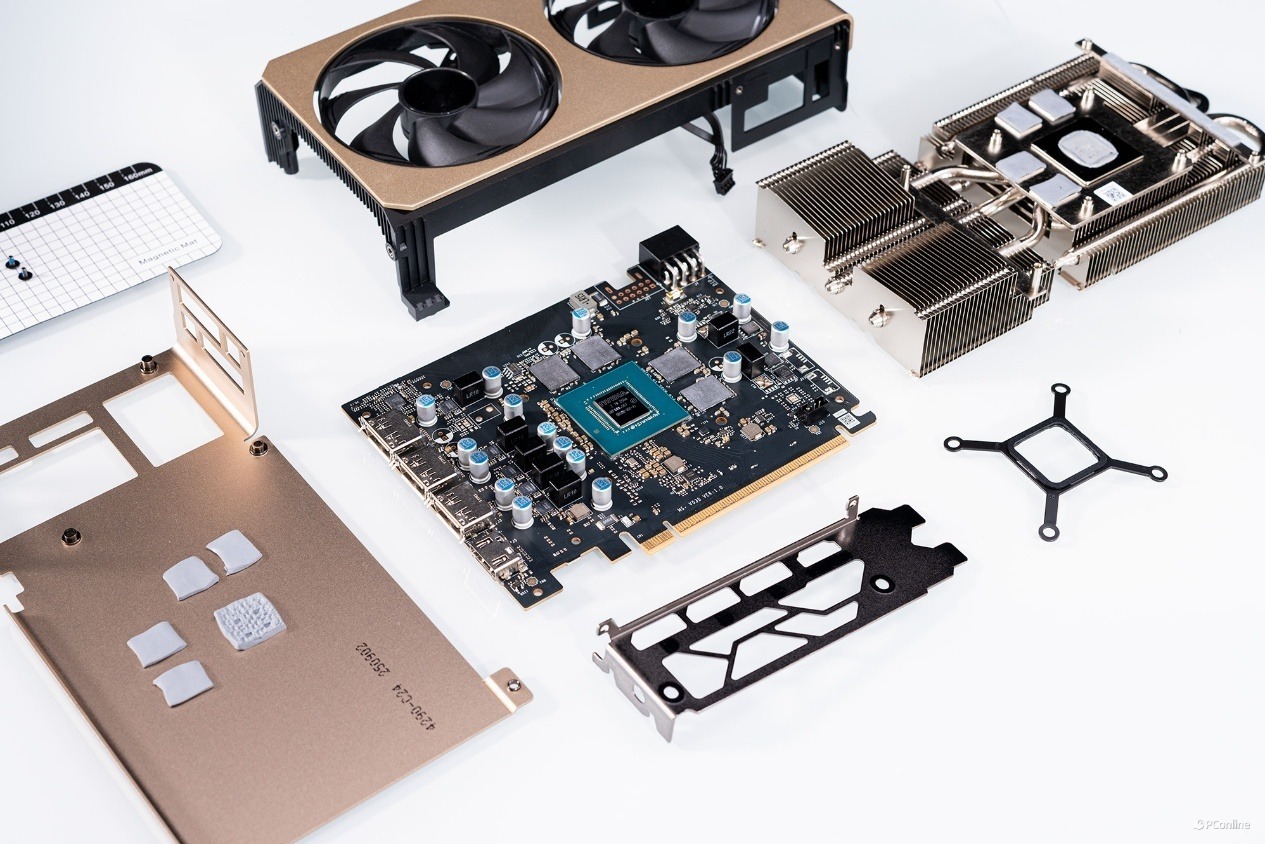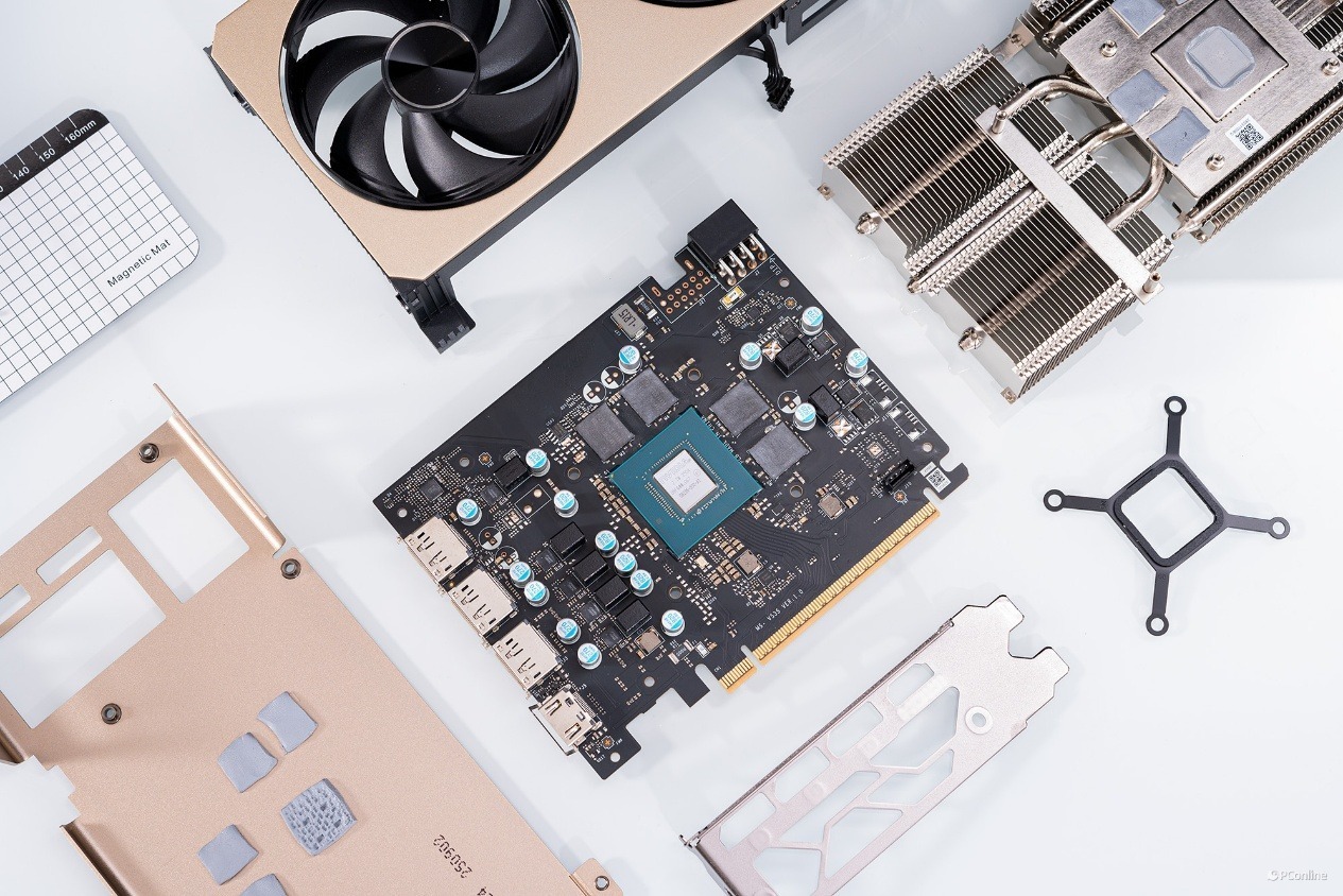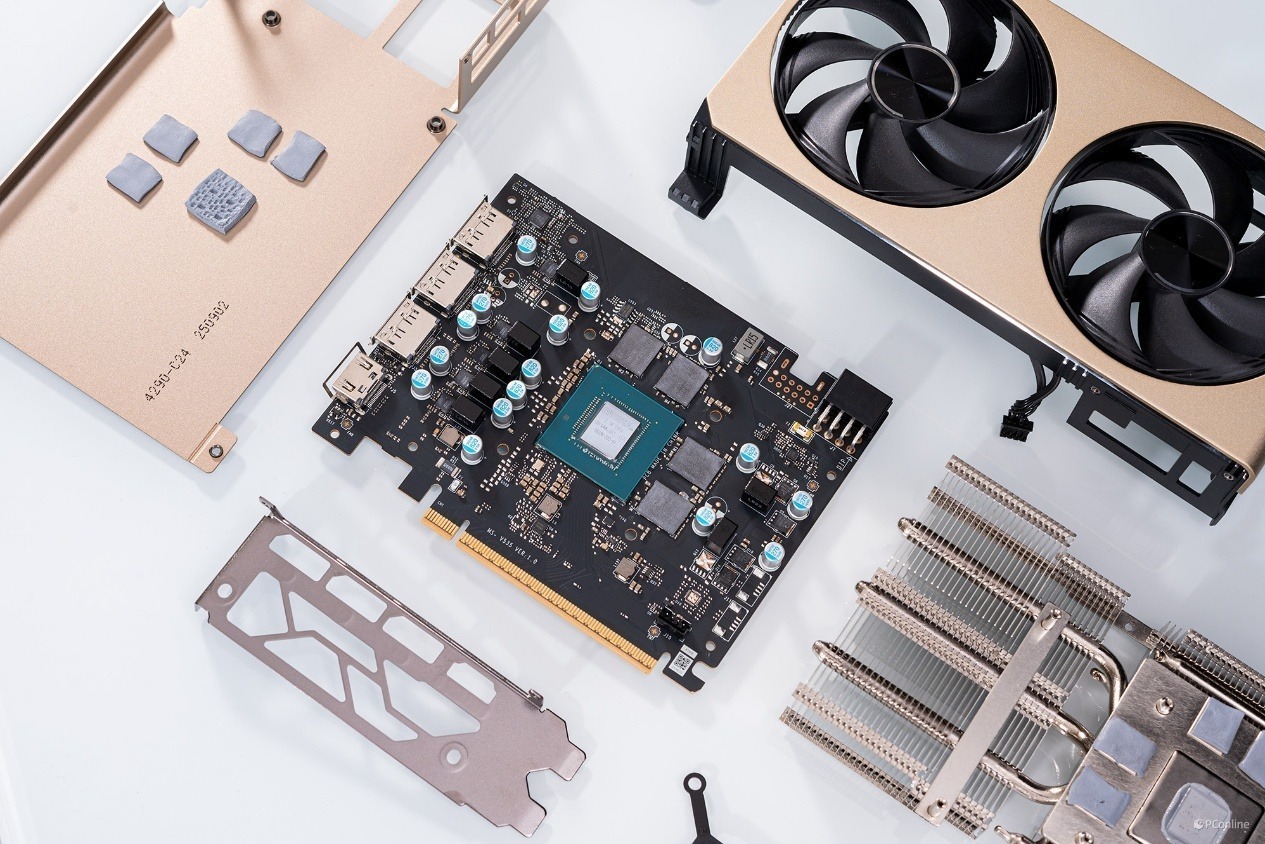 翻转视角看看显卡的背部,其背板采用全金属打造,同时延续了正面香槟金的配色。在不同的光线下,显卡背部会呈现不同的视觉效果,造就了低调的精致感。
