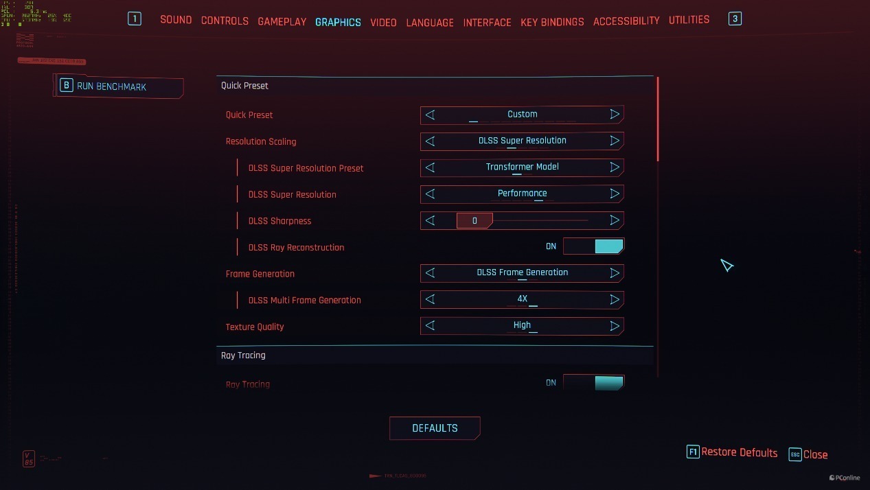 接着我们看看DLSS 4在实际游戏中的表现,率先登场的就是有着“显卡杀手”之称的《赛博朋克2077》,它的设置页面是目前支持DLSS 4游戏中最为丰富一款,除了能够设置DLSS 4的多帧生成外,还可以切换DLSS 4的另一个特性——Transfomer Mode,据说能够让画质更清晰,同时还能改善此前的拖影问题,对玩家可以说是一大利好。