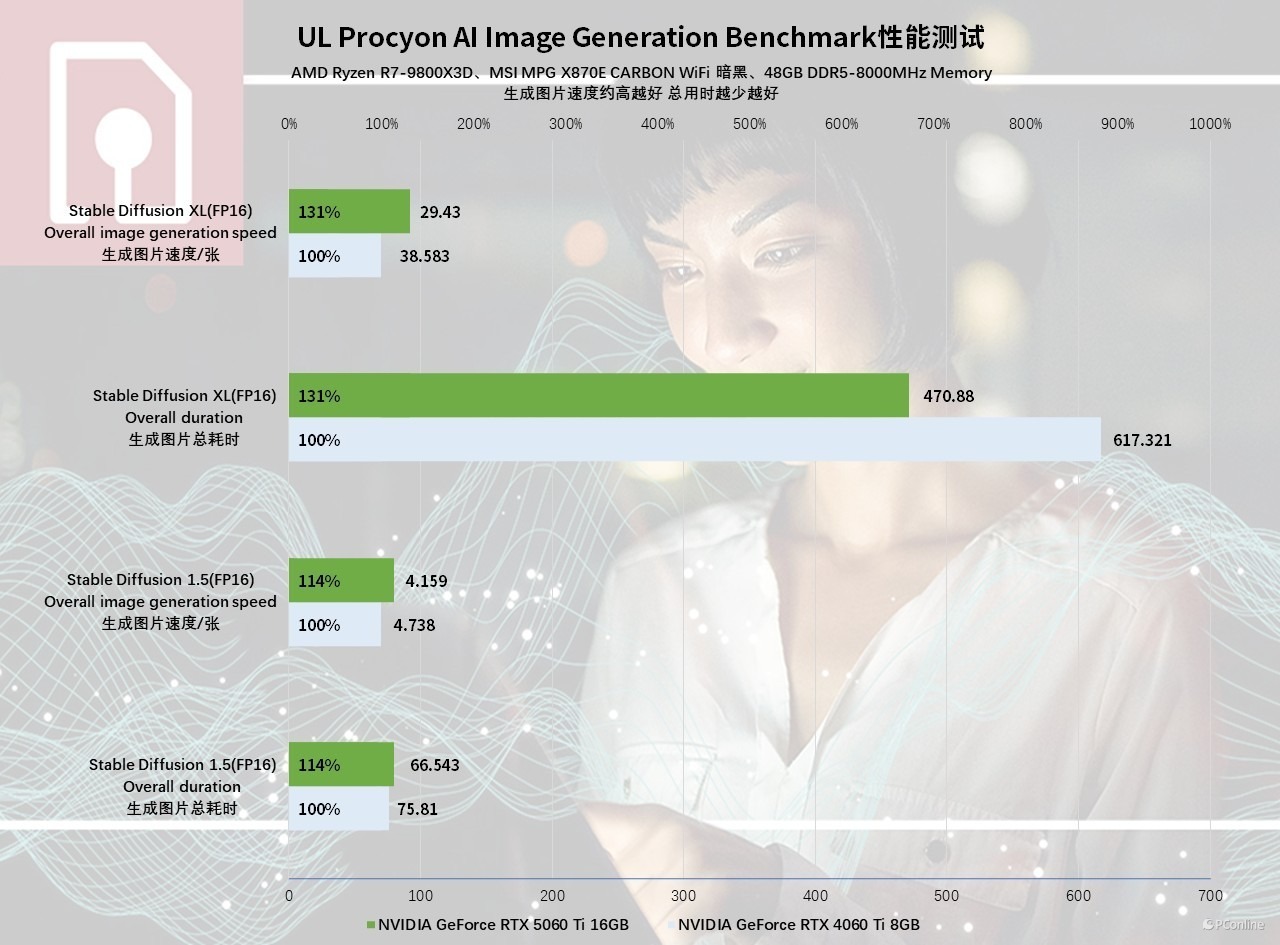 看过了FP4以及FP8,我们再看看微星GeForce RTX 5060 Ti INSPIRE 2X 硬派师16GB在Stable Diffusion中FP16下的表现如何,还是用UL Procyon进行测试,在比较轻松的SD 1.5文生图测试里,微星GeForce RTX 5060 Ti INSPIRE 2X 硬派师16GB的表现非常优秀,生成一张图的速度仅需66.543秒,效率比上代显卡快了14%。而即便是在压力比较大的SDXL中,优势也非常明显,生成一张图的速度为29.43秒,同样领先RTX 4060 Ti约31%。