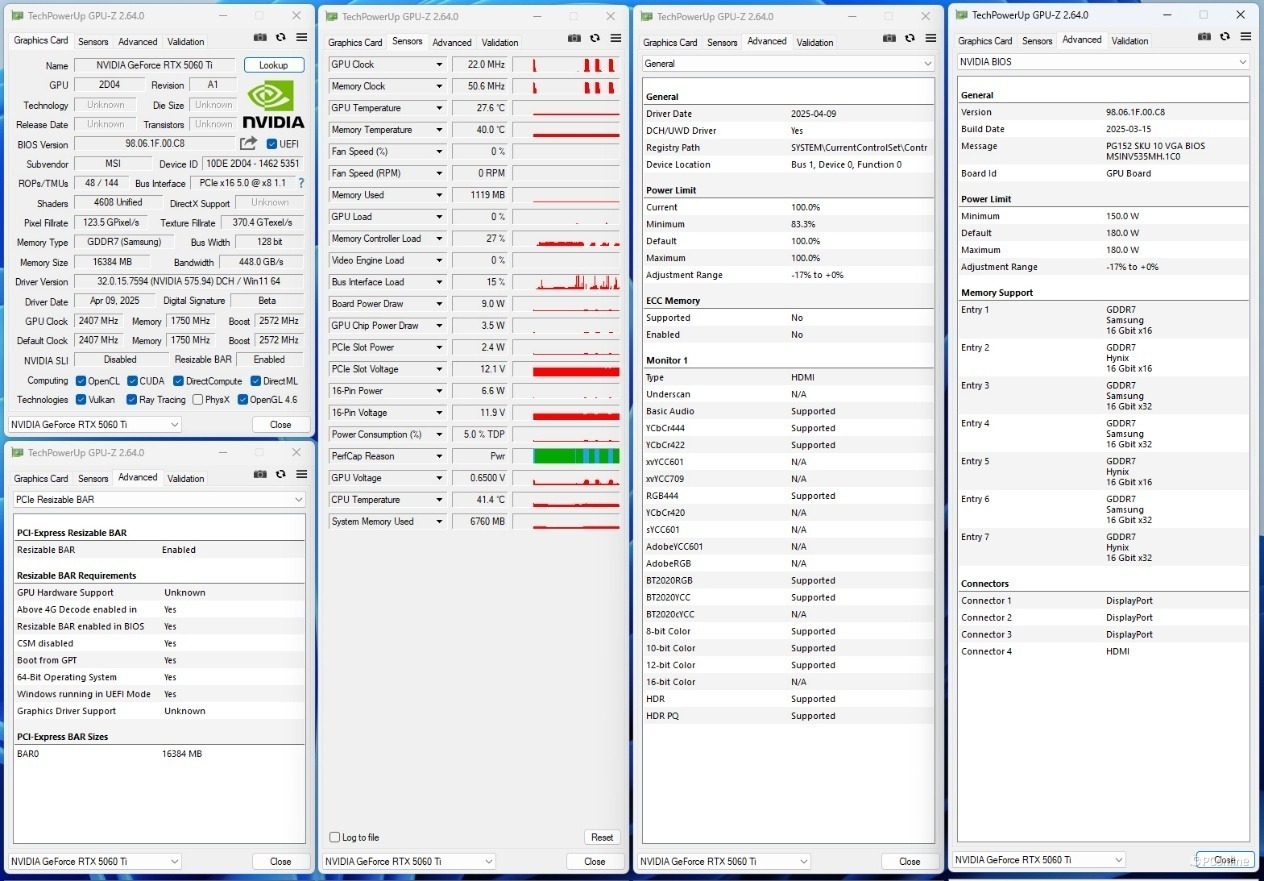 开始测试前,照例还是要“认识”一下这张显卡。从GPU-Z的信息中可以看到微星GeForce RTX 5060 Ti INSPIRE 2X 硬派师16GB的基准频率为2407MHz,Boost频率为2572MHz,这个频率对比前代RTX 4060 Ti的话,可以说提升了不少。除此之外,这张显卡的TDP也比前代稍高一些,为180W。并且换装了更高级的GDDR7显存,能够带来448GB/s的显存带宽。