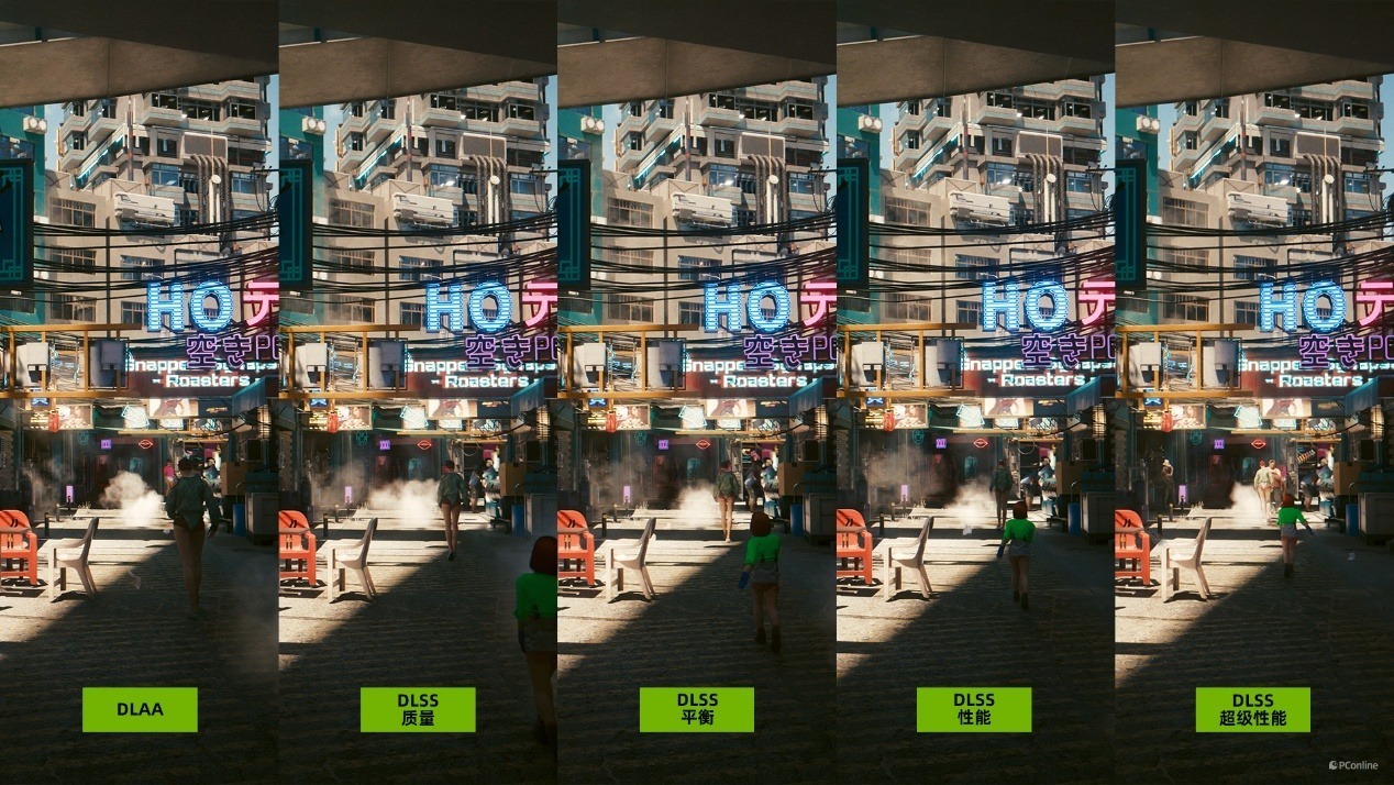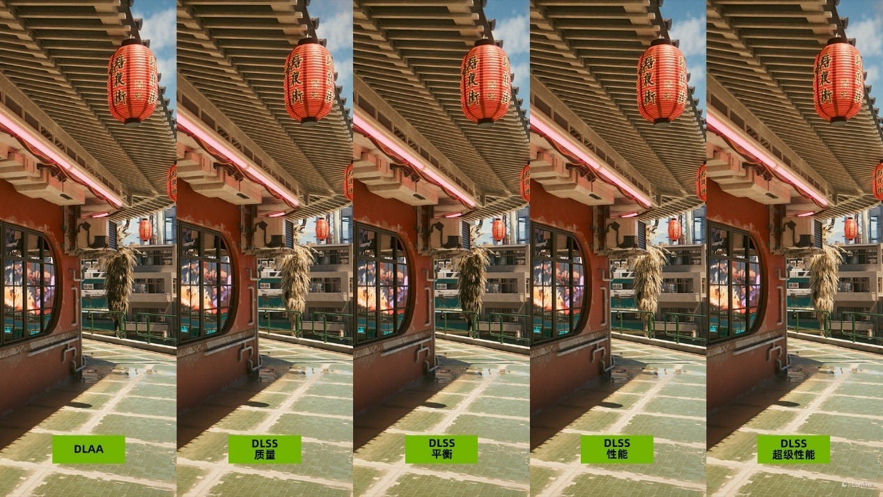 第二与第三个场景还是能够看出部分细节的,例如第二幅图中的霓虹灯牌,DLSS开至性能档以后,能够看到灯牌与前面三张图有些许差异,不过你得靠细致的对比才能看出。实际游戏过程中很难发现,基本不影响观感。
