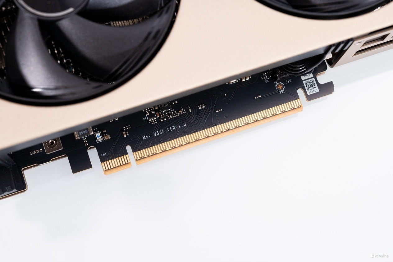 当然,参与供电的不止8Pin接口,显卡底部的PCIe金手指也会参与部分供电。并且这一代显卡的PCIe接口升级成为了5.0速率,这也是首次在RTX 50系显卡上应用,能够带来更高的传输速率,另外仔细看金手指的形状,它和上一代的显卡也有些微的变化。