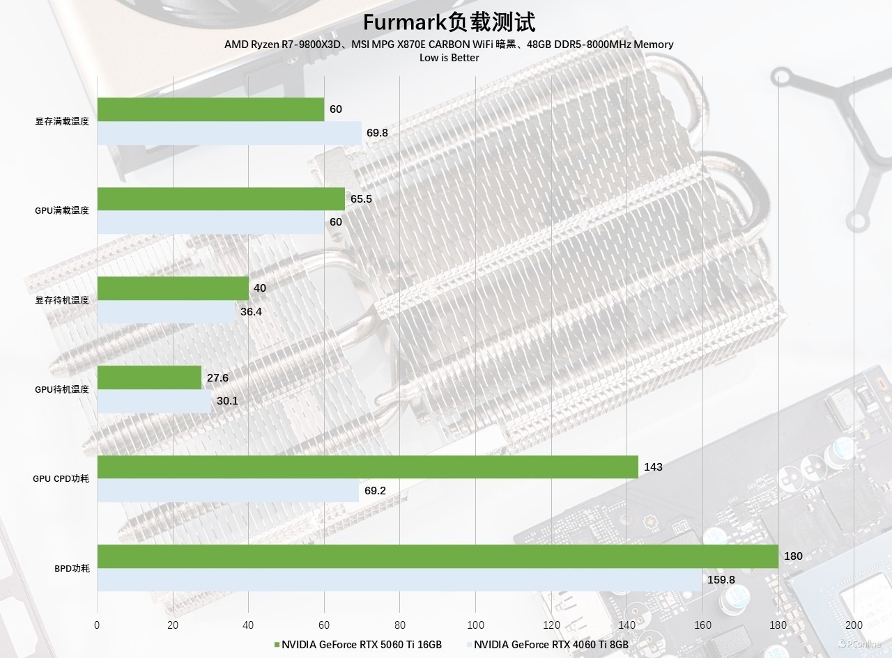 横向对比RTX 4060 Ti时可以看到,虽然新显卡的TDP提升了,不过整体的烤机功耗并不算高,特别是微星GeForce RTX 5060 Ti INSPIRE 2X 硬派师16GB显卡拥有暴风7风扇、镀镍铜底座、波浪形导流鳍片、方形核心热管等硬核配置,整体的散热效果极其出色,部分温度甚至比150W的RTX 4060 Ti还要低,属于是非常惊喜了。