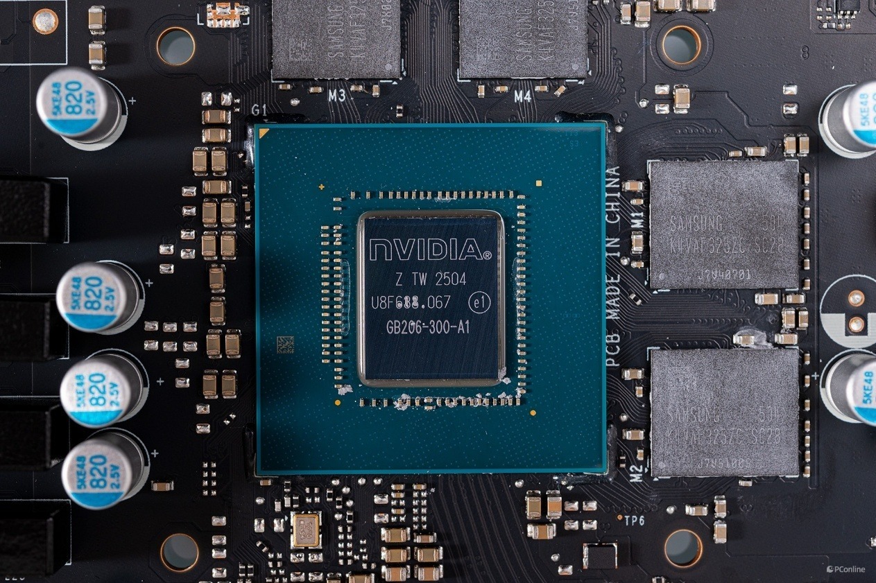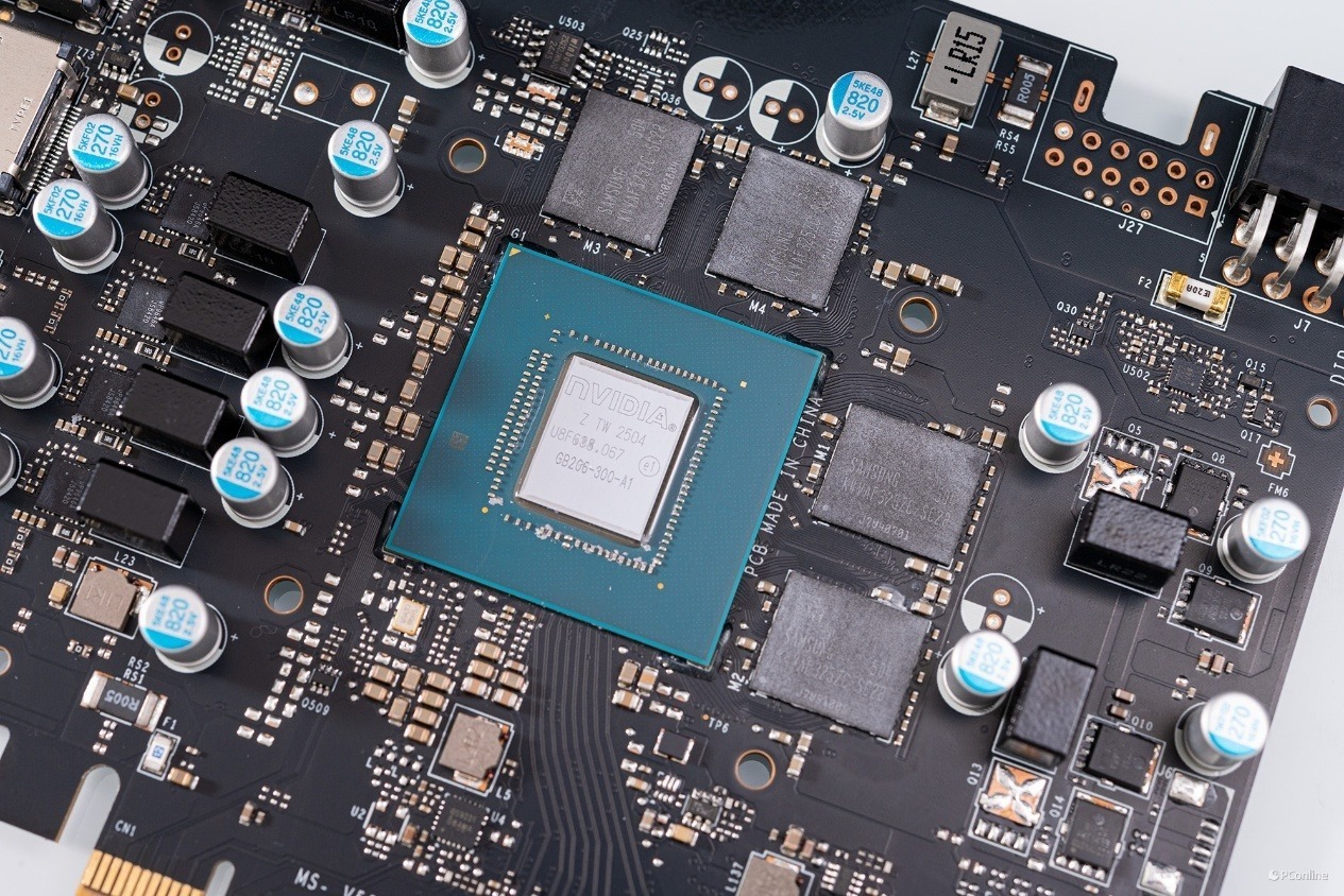PCB的中央则是本次测试的重点,GB206-300-A1核心,它就是微星GeForce RTX 5060 Ti INSPIRE 2X 硬派师16GB的大脑,由TSMC 4N工艺打造,拥有4608组CUDA核心,稍多于RTX 4060 Ti,通用的图形性能自然更强。