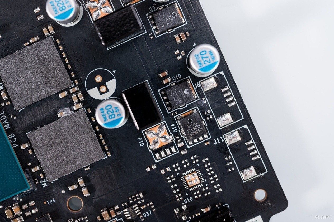 显存供电的DrMOS则分为上下桥设计,型号分别为PK616BA以及PKE96BB。