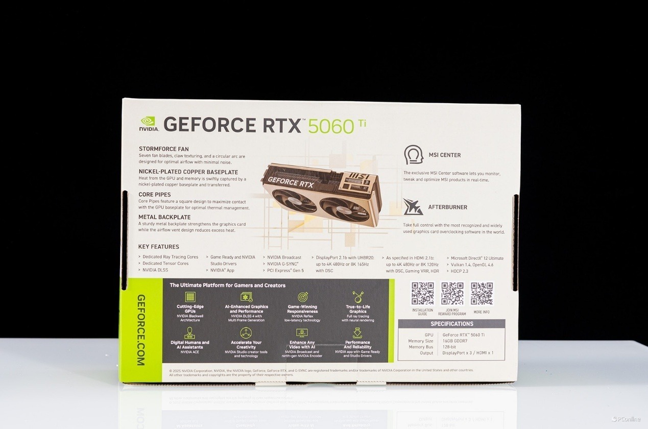 除此之外,GeForce RTX 5060 Ti 16GB还配备了全新的GDDR7显存,显存等效频率可达28Gbps,同时16GB的大容量显存也能为玩家提供高分辨率下的极致帧率,同时还能兼顾大部分AIGC用户的应用需求,多重黑科技加持下,高分辨率出图也可更加高效。同时视频输出接口也进行了升级,能够兼顾高分辨率与高刷新率,后续开箱显卡时我们会详细介绍。