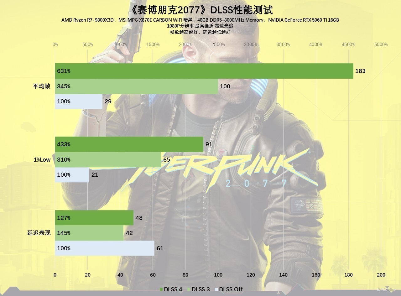 见识完Transformer模型的魅力以后,我们再来看DLSS 4的性能表现,毕竟是“显卡杀手”,对显卡的压力确实不一般,在最高画质+路径追踪的情况下,微星GeForce RTX 5060 Ti INSPIRE 2X 硬派师16GB只能跑29 FPS,完全不可玩。开启DLSS 3以后,游戏帧数为100 FPS,体感已经非常流畅了。开启DLSS 4以后,微星GeForce RTX 5060 Ti INSPIRE 2X 硬派师16GB能够做到183 FPS,对比原生分辨率,性能足足提升了6.3倍。1%Low就更离谱了,几乎快要追上DLSS 3下的平均帧了,整体游戏体验更佳。
