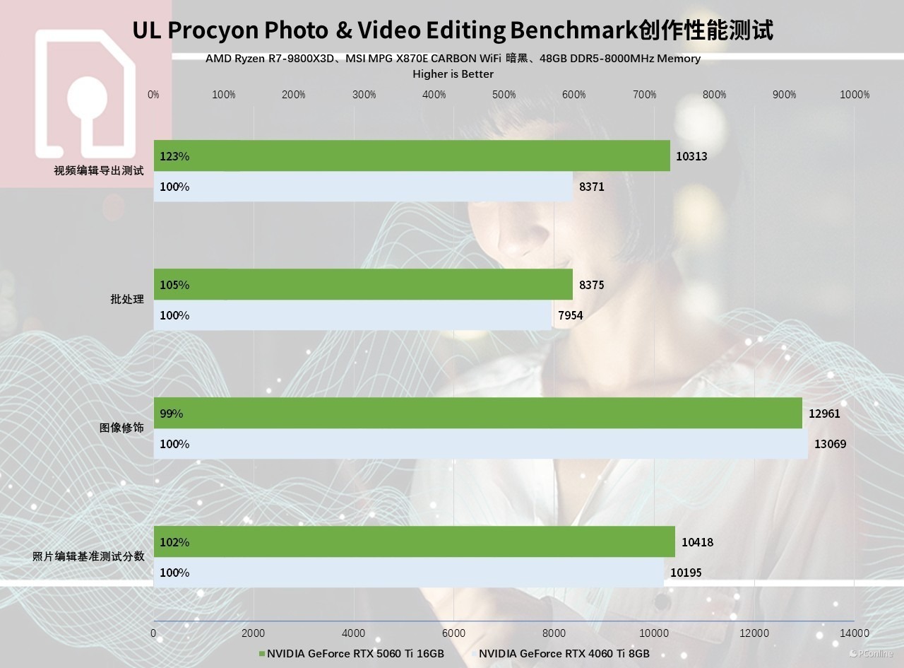 再看图像编辑与视频创作的表现,还是UL Procyon的测试,两款显卡在图像编辑上也是不相上下,性能差距仅有2%左右,不过在视频剪辑方面,微星GeForce RTX 5060 Ti INSPIRE 2X 硬派师16GB的优势就比较大了,足足有23%之多。