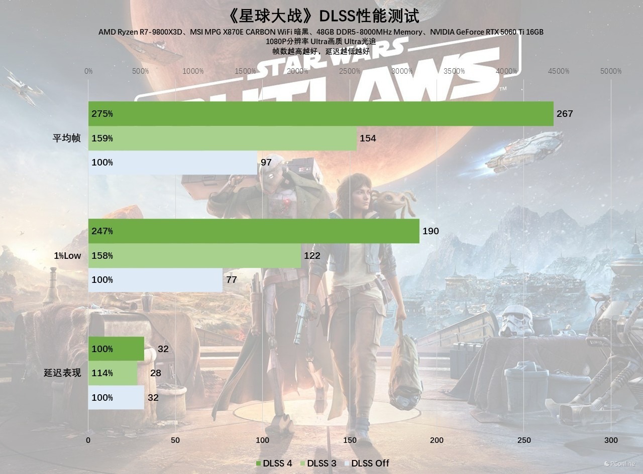 实测DLSS 4在这类优化欠佳的游戏中确实大有用处,在1080P原生分辨率下,微星GeForce RTX 5060 Ti INSPIRE 2X 硬派师16GB的平均帧仅有97 FPS,整体游玩体验还不错。而开启DLSS 4质量档以后,游戏平均帧直接暴增至267 FPS,游戏体验如德芙般丝滑,对比原生1080P的表现,足足有2.7倍左右的提升。即便是对比DLSS 3的154 FPS,那也是接近翻倍的性能提升。