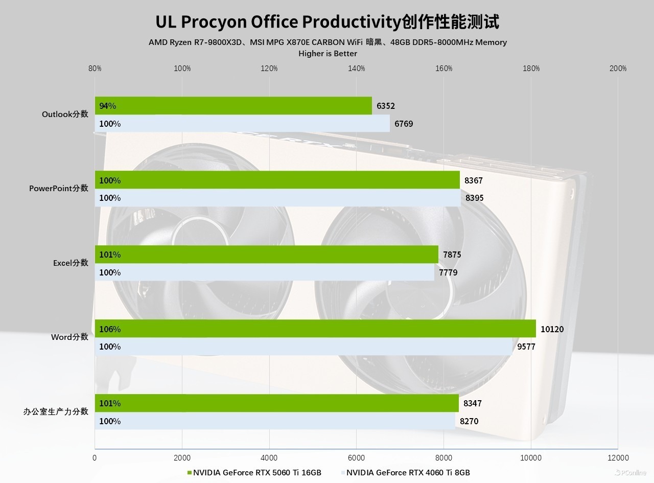 办公软件测试中,微星GeForce RTX 5060 Ti INSPIRE 2X 硬派师16GB表现也不错,两款显卡基本都是五五开的水平,办公对整体性能要求没有那么高,以这两张卡的实力都能轻松满足。