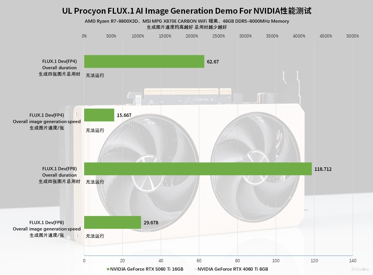 首先我们用UL Procyon的FLUX.1 AI Image Generation Demo For NVIDIA进行测试。在FP8精度模型测试时,微星GeForce RTX 5060 Ti INSPIRE 2X 硬派师16GB能够做到29.678s生成一张图,而RTX 4060 Ti可能是由于显存的原因,无法完成测试;而切换到FP4精度模型后,微星GeForce RTX 5060 Ti INSPIRE 2X 硬派师16GB的速度有了比较大的进步,生成图片的速度能够做到15.667s一张,效率直接翻倍。而RTX 4060 Ti依旧无法运行,这已经不是快慢的问题了,因此喜欢AI的玩家真的要认真考虑一下,更大显存的微星GeForce RTX 5060 Ti INSPIRE 2X 硬派师16GB才是决定AI的胜负手。