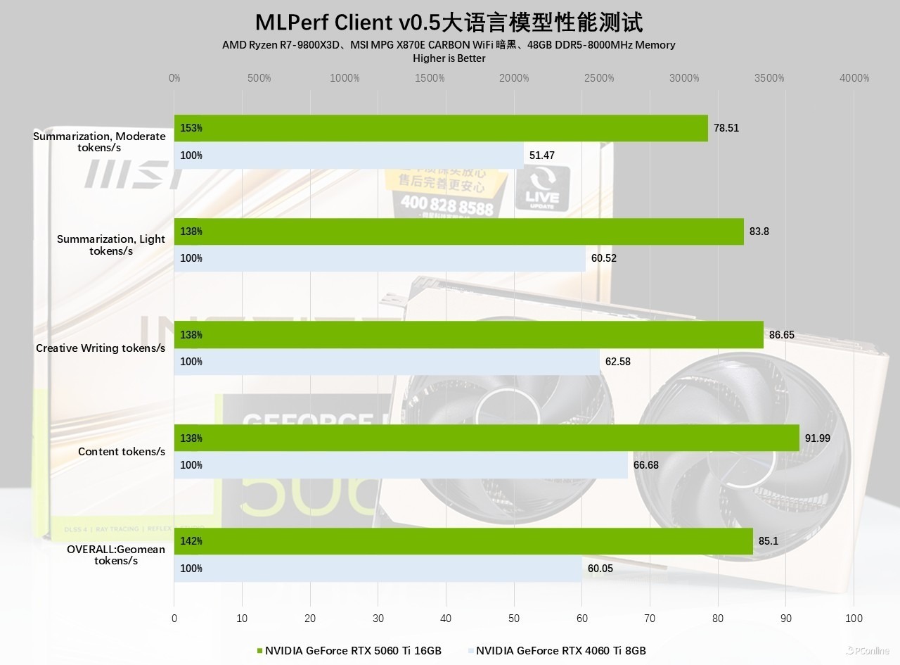 AI文本生成测试我们也测了,微星GeForce RTX 5060 Ti INSPIRE 2X 硬派师16GB在这部分的表现甚至要更加出众,我们用MLPerf Client v0.5大语言模型进行测试,它是基于meta的Llama 2 7B开源LLM打造,涵盖了四项AI任务,分别是内容生成、创意写作以及对两份不同长度文本进行总结摘要。实测新显卡在每一项中都表现出了绝对的统治力,各项测试均遥遥领先,性能提升幅度最高可以去到53%!