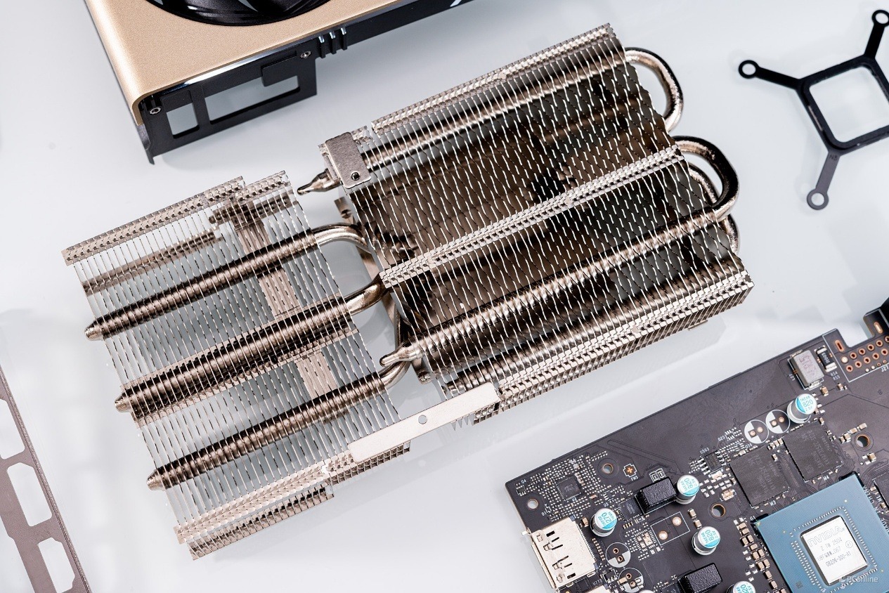 整个显卡散热模组还是非常硕大的,微星针对其配备了广布式方形热管,这样设计的目的是,方形热导管布局更大,能够充分和均热板接触,从而提升整体冷却效能。