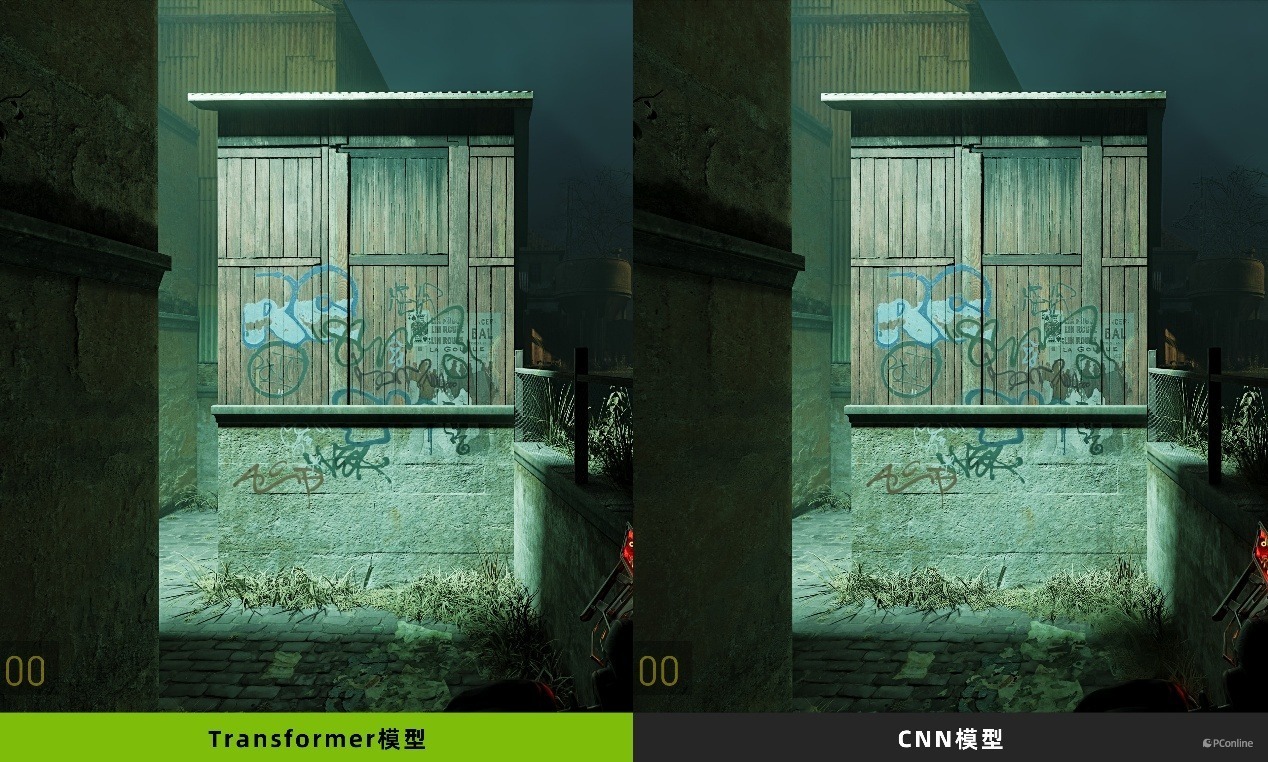 不过Transformer模型目前也并非万能,毕竟是由AI生成而来,因此在部分细节上还是有些错误的。例如下方的窗口部分,阳光照射下应该是斑驳的光影,比较正确显示的应该是CNN模型中的样式。整体来看,现在Transformer模型瑕不掩瑜,大幅改善的画面细节能够给玩家带来更精致的游戏展现。