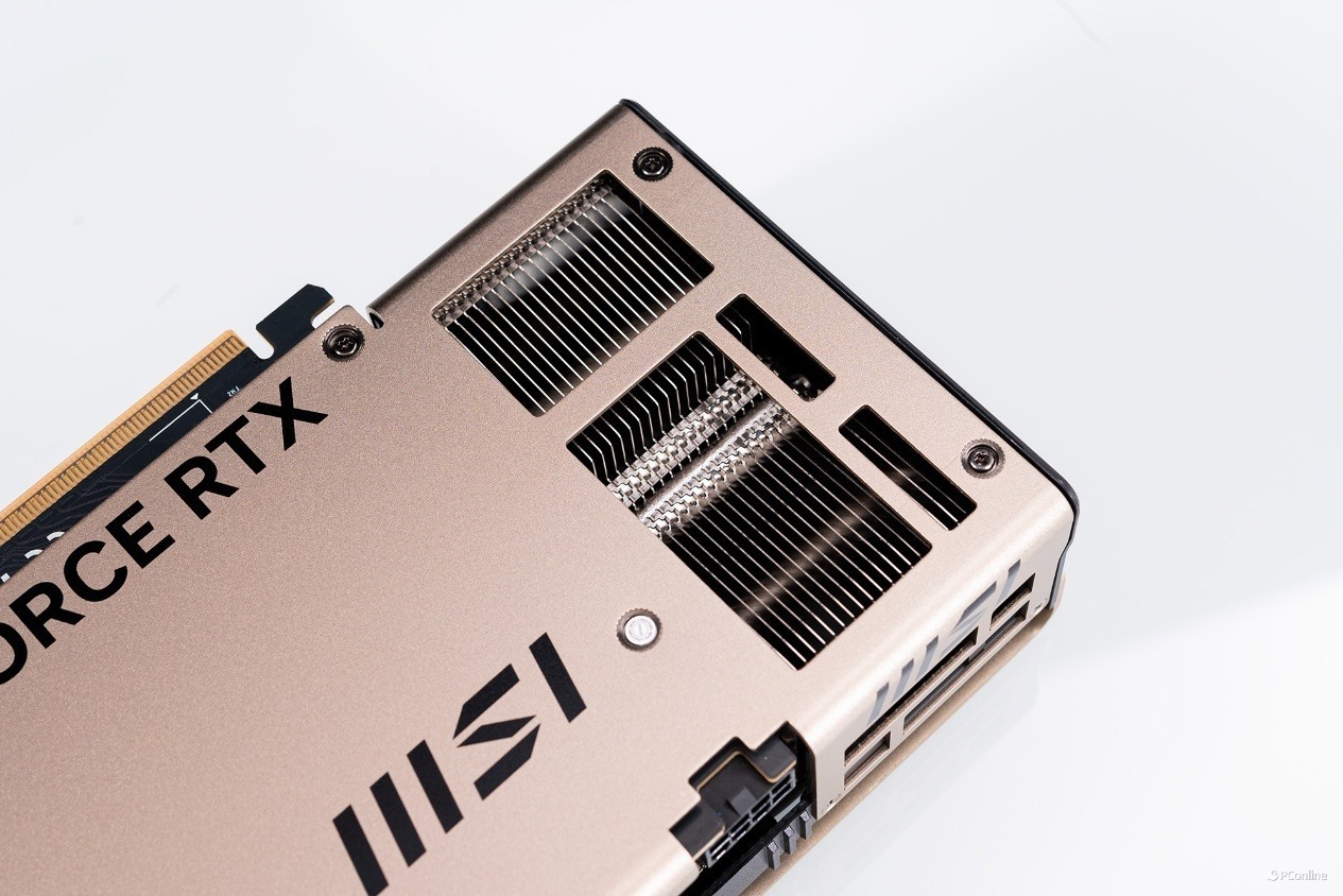 在显卡背部的左侧则是镂空的散热窗口设计,这样做的目的是加速显卡内部的空气流动,达到提升散热的目的。并且镂空窗口附近还有MSI的LOGO标志,既是点缀,也是辨识度的一种。