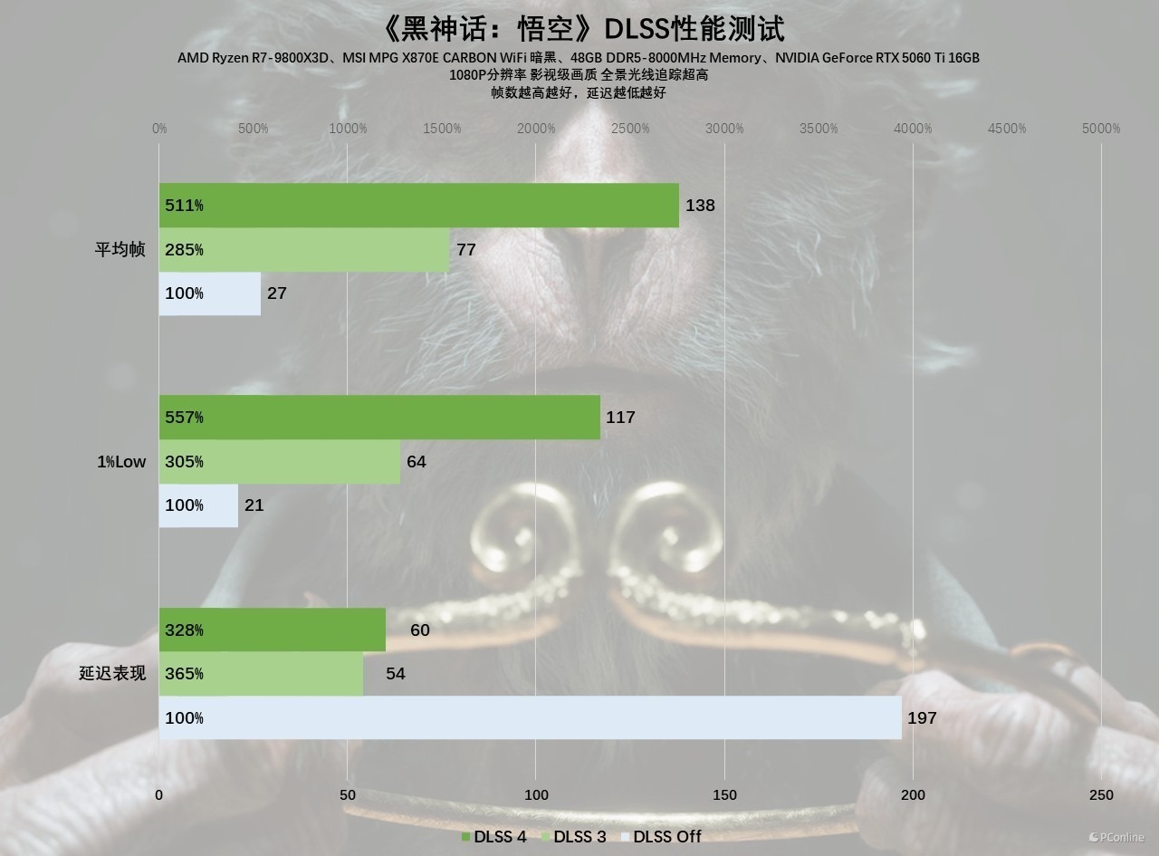 我们在1080P下将画质调整至影视级,全景光追也拉到最高,此时微星GeForce RTX 5060 Ti INSPIRE 2X 硬派师16GB在不借助任何超分技术的条件下,游戏帧数仅有27 FPS。而有DLSS 3的帮助后,游戏帧数也回到了流畅的水准77 FPS;这时如果你有RTX 50系显卡,开启DLSS 4多帧生成以后,游戏帧数将再度飞跃,138 FPS的表现相当夸张,对比原生分辨率提升了5.1倍以上,直接由可玩变爽玩了。