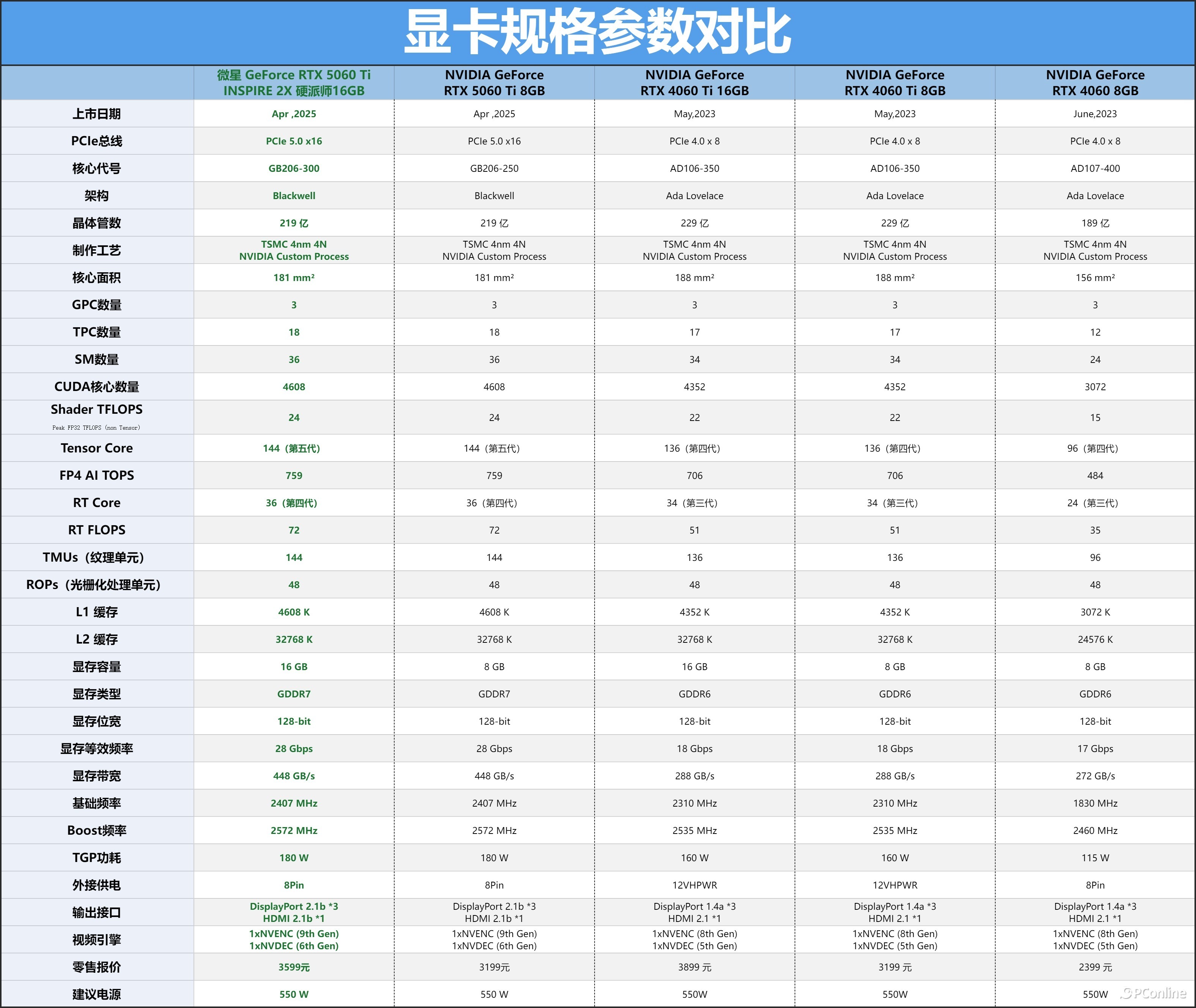 最后一点区别就是售价了,全新上市的GeForce RTX 5060 Ti 16GB MSRP版本官方建议零售价为3599元,对比上代的GeForce RTX 4060 Ti 16GB便宜了300元左右。更先进的架构设计与更激进的性能释放,还有更低廉的售价,绝对是主流玩家的甜品之选。