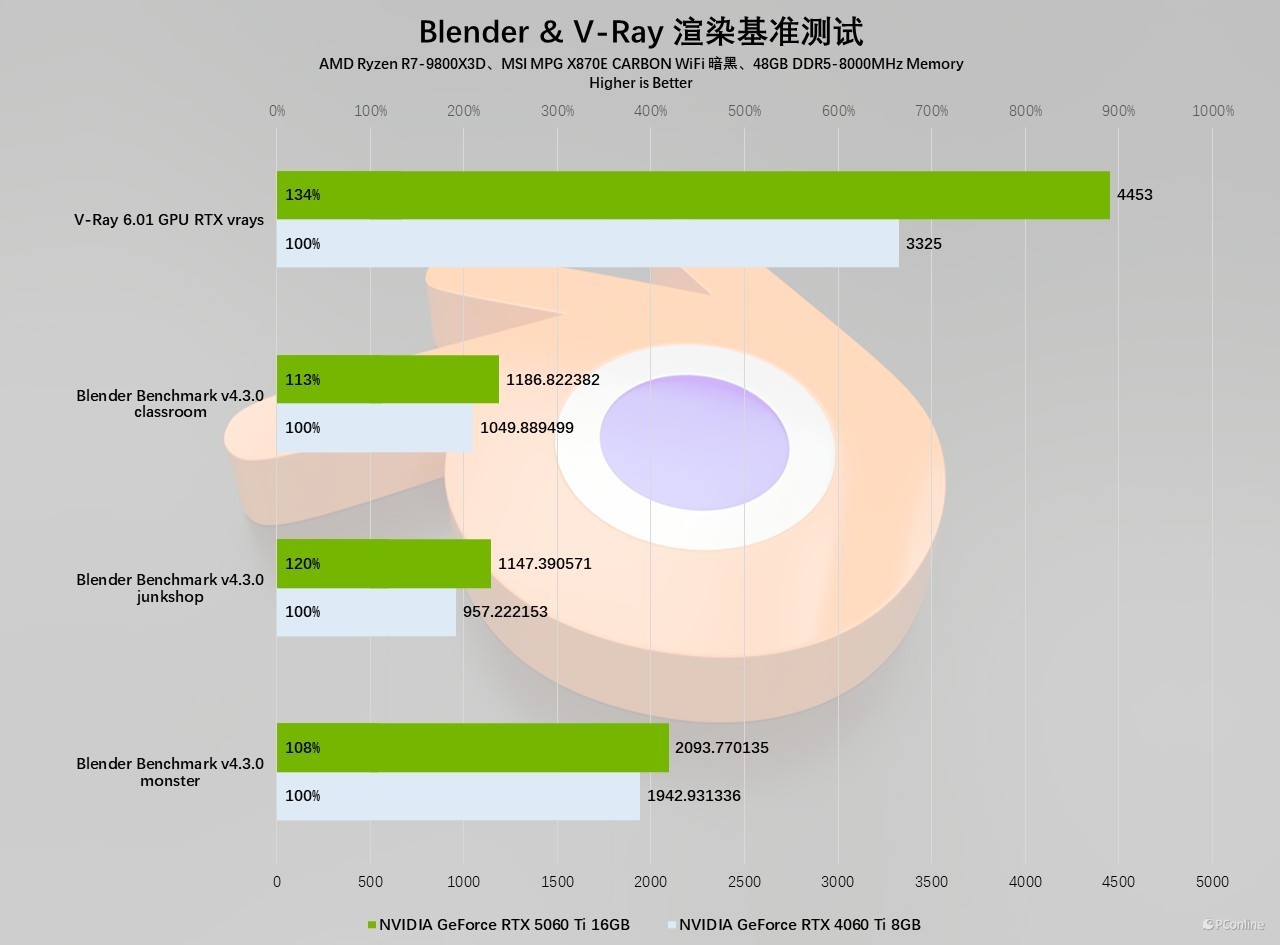 图像视频创作方面,微星GeForce RTX 5060 Ti INSPIRE 2X 硬派师16GB的优势非常明显,不知道3D渲染创作方面又如何呢?在Blender以及V-Ray两款软件中,微星GeForce RTX 5060 Ti INSPIRE 2X 硬派师16GB的表现再度给大家带来了惊喜,其中前者基本上能领先RTX 4060 Ti达20%左右,而后者中,领先优势也非常巨大,对比40系显卡,领先幅度高达30%以上。