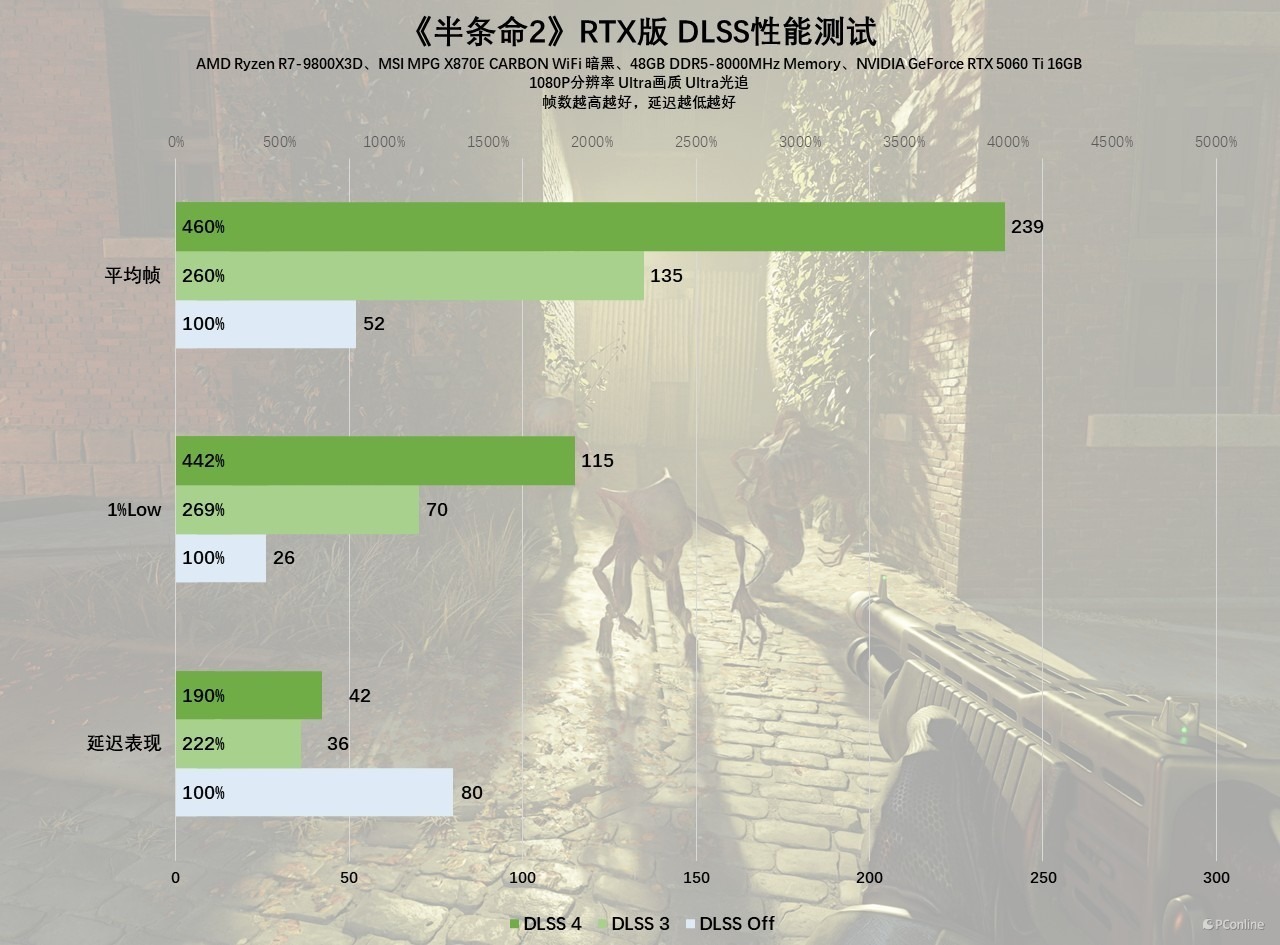 实测下来,只能说《半条命2》RTX版对硬件的开销极大,在原生1080P分辨率下,所有画质、光追均开至最高,不开启超分选项时,微星GeForce RTX 5060 Ti INSPIRE 2X 硬派师16GB帧数为52 FPS。在开启DLSS 3质量档以后,游戏帧数瞬间来到了135 FPS,体验都变得丝滑了许多,而继续开启DLSS 4质量档,游戏帧数又在原来的基础上上涨了100 FPS,对比原生1080P的表现,性能提升高达4.6倍!1%Low的表现也差不多,领先幅度也是4倍以上。
