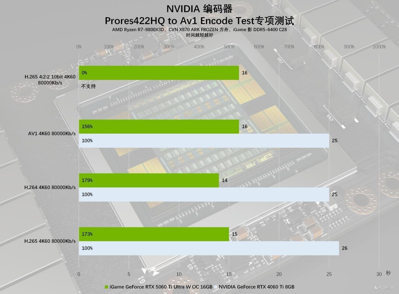 在Adobe和达芬奇的Benchmark测试中,iGame RTX 5060 Ti Ultra W OC 16GB相较于RTX 4060 Ti也有所提升。特别是在视频编辑方面,提升尤为显著。这主要归功于新一代RTX 50系显卡对编码器的升级,不仅提高了编解码的效率,还扩展了支持的格式种类。例如,在达芬奇和PR的测试中,iGame RTX 5060 Ti Ultra W OC 16GB相较于RTX 4060 Ti领先约30%,总体而言,内容创作的效率得到了显著提升。