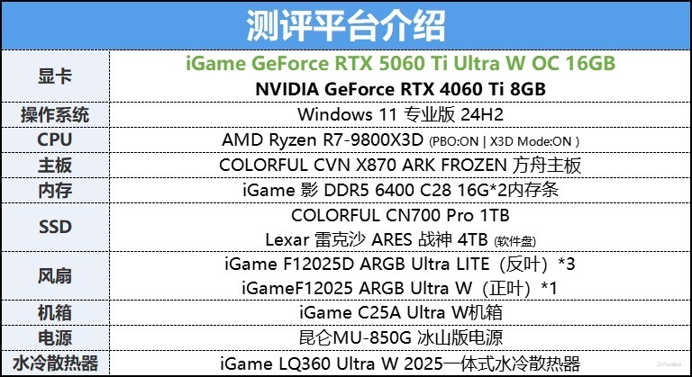 至于对标的测试显卡,我们这次拿出的RTX 4060 Ti 8GB与iGame RTX 5060 Ti Ultra W OC 16GB进行性能对比,分别对理论性能、游戏性能、DLSS性能、创作能力、AI性能,以及功耗等不同维度的表现。