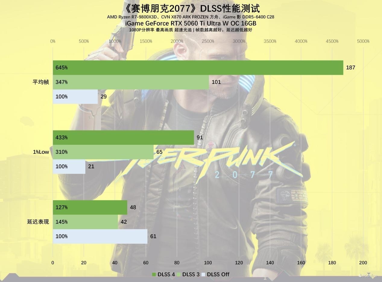 在领略了Transformer模型的神奇之后,让我们转向DLSS 4的性能展示。作为“显卡杀手”,DLSS 4对显卡的挑战无疑是巨大的。在最高画质与路径追踪的设置下,iGame RTX 5060 Ti Ultra W OC 16GB的帧率仅为29 FPS,这使得游戏体验变得不可接受。然而,当启用DLSS 3技术后,游戏的帧率飙升至101 FPS,流畅度显著提升。进一步开启DLSS 4,iGame RTX 5060 Ti Ultra W OC 16GB的表现更是惊人,达到了187 FPS,相较于原生分辨率,性能提升了惊人的6.3倍。即便是1%Low的帧率也令人印象深刻,几乎与DLSS 3下的平均帧率持平,整体游戏体验因此得到了极大的改善。