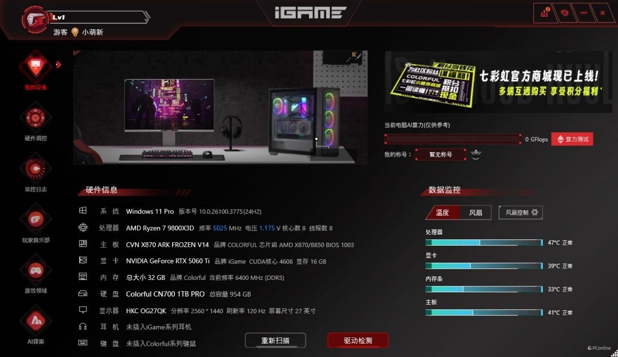 在AI时代,iGame 自在星球的一大亮点是AI 桌宠“柒小希”,这是iGame 推出的原创IP虚拟代言人,也是iGame 自在星球(原iGame Center)的核心模块,它在人机交互方面扮演着关键角色。玩家可以利用语音指令实现硬件的精确控制。例如,当玩家说出“游戏卡顿”,她能够运用AI智能超频技术对CPU进行优化,并调整内存分配;同时,她还能通过AI算法检测电脑的健康状况,支持查看系统配置和硬件状态,实时监控CPU、GPU等组件的运行数据,帮助用户高效管理硬件。