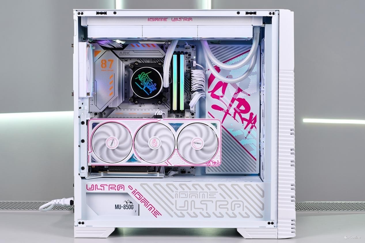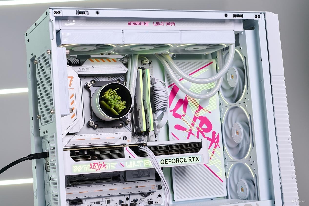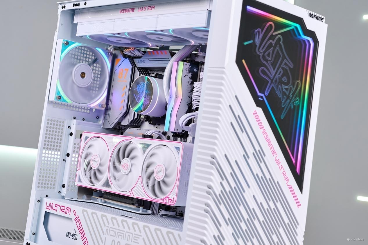 而为了压制AMD 锐龙9 9800X3D处理器,一体水冷散热器则是采用了iGame LQ360 Ultra W 2025。其外观超吸睛,通体纯白,与各类机箱风格都能完美适配。冷头更是采用 iGame 深渊镜设计,点亮后散发神秘深邃的光芒,和机箱前脸呼应,科技感爆棚。