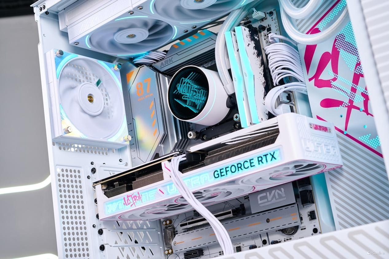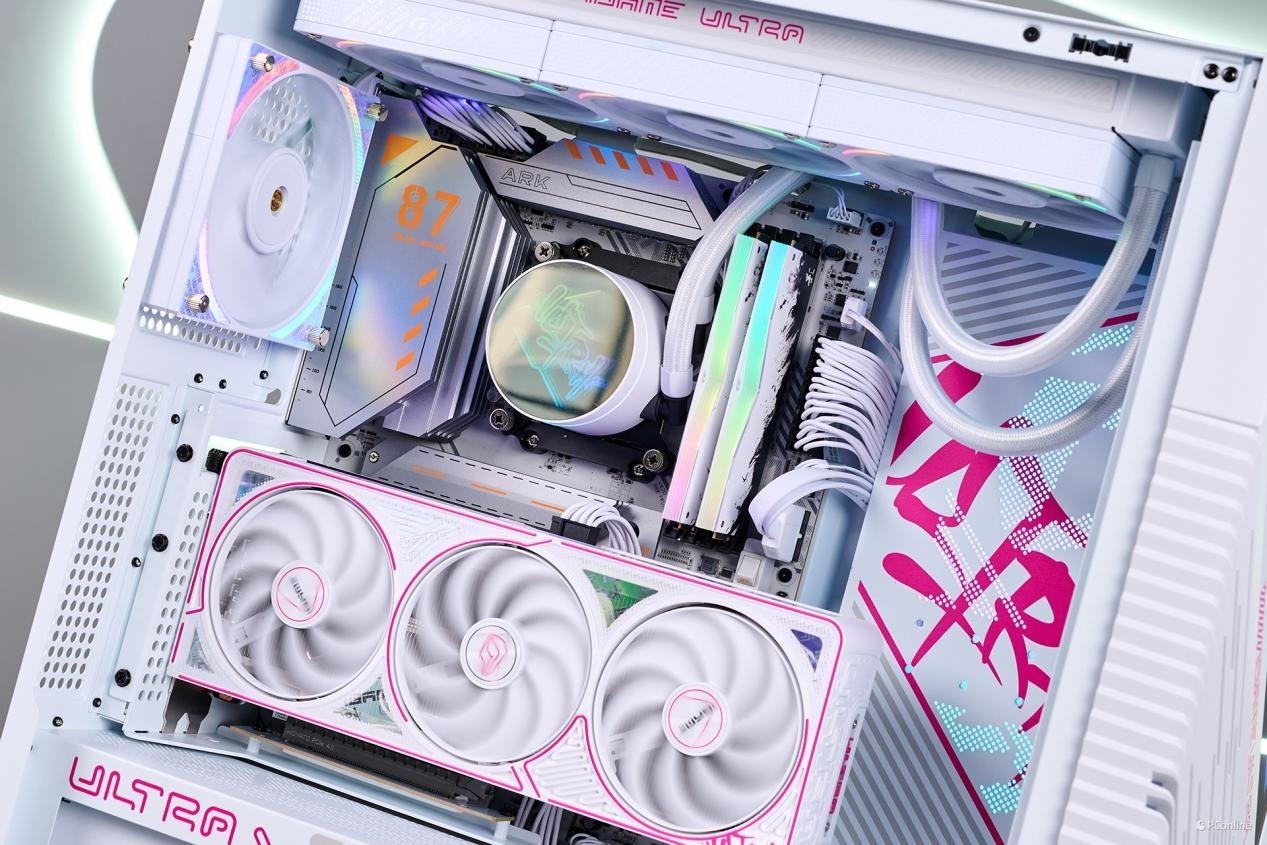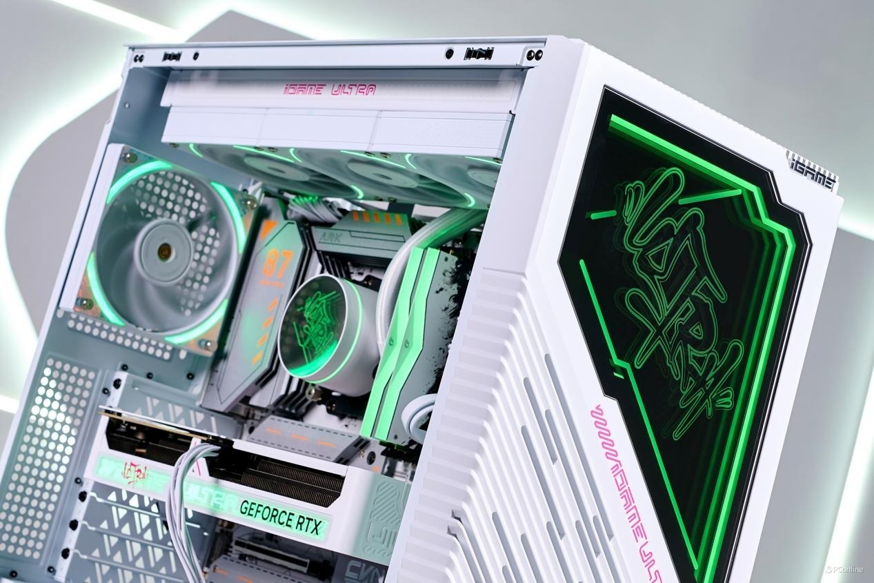 而为了压制AMD 锐龙9 9800X3D处理器,一体水冷散热器则是采用了iGame LQ360 Ultra W 2025。其外观超吸睛,通体纯白,与各类机箱风格都能完美适配。冷头更是采用 iGame 深渊镜设计,点亮后散发神秘深邃的光芒,和机箱前脸呼应,科技感爆棚。