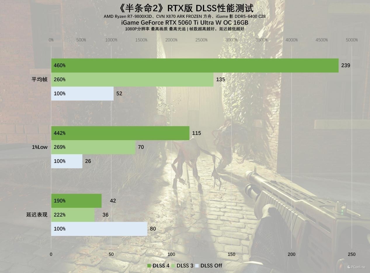 实测下来,只能说《半条命2》RTX版对硬件的开销极大,在原生1080P分辨率下,所有画质、光追均开至最高,不开启超分选项时,iGame RTX 5060 Ti Ultra W OC 16GB帧数为52 FPS。在开启DLSS 3质量档以后,游戏帧数瞬间来到了135 FPS,体验都变得丝滑了许多,而继续开启DLSS 4质量档,游戏帧数又在原来的基础上上涨了100 FPS,对比原生1080P的表现,性能提升高达4.6倍!1%Low的表现也差不多,领先幅度也是4倍以上。