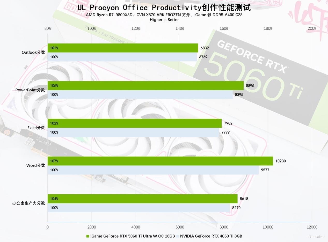 在办公软件的测试环节中,iGame RTX 5060 Ti Ultra W OC 16GB同样表现出色。两款显卡的性能几乎旗鼓相当,由于办公应用对硬件性能的需求相对较低,这两款显卡都能够轻松应对。