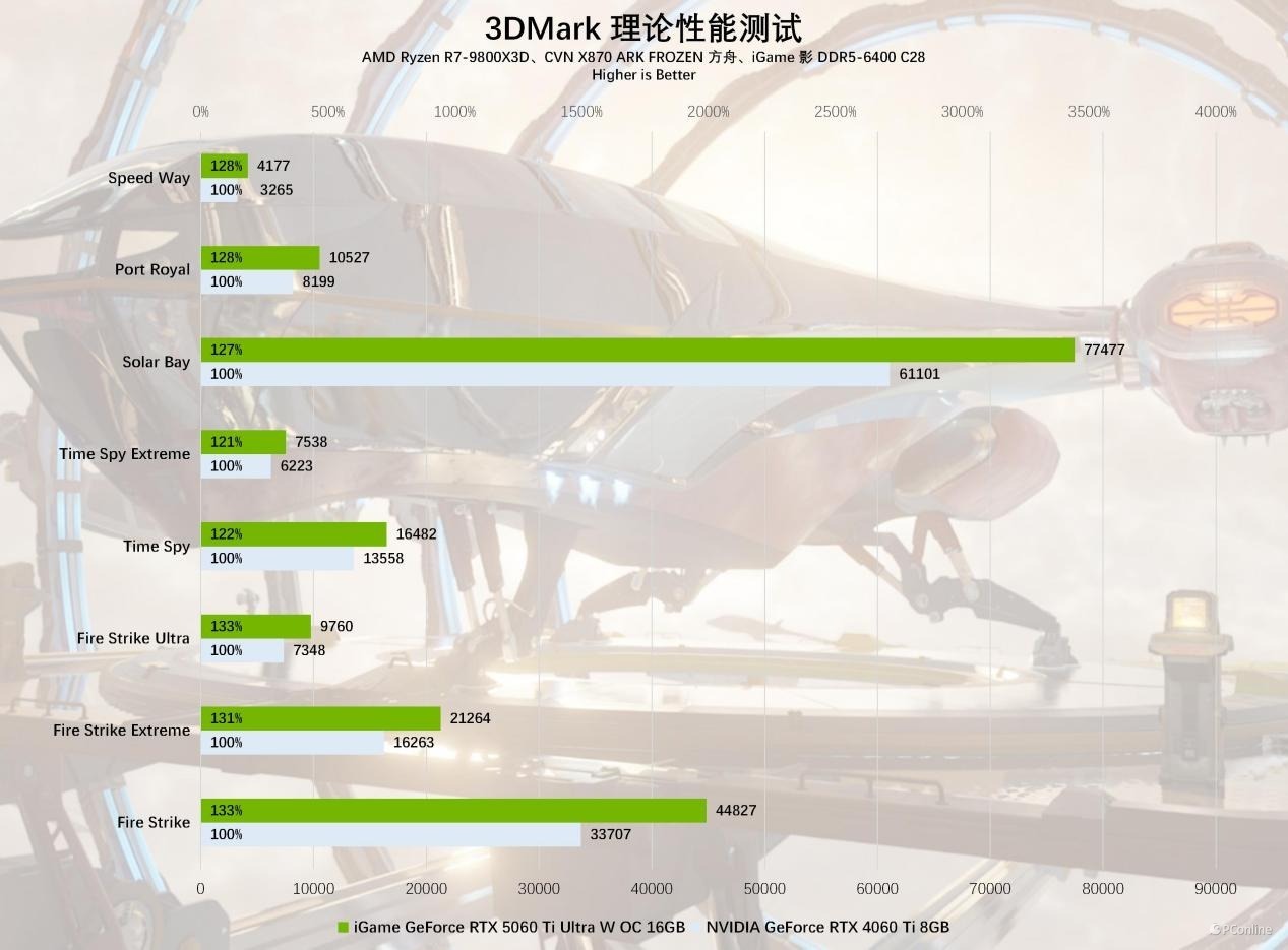 在理论性能测试方面,通过3DMark的Fire Strike系列测试,iGame RTX 5060 Ti Ultra W OC 16GB的表现令人瞩目,其领先RTX 4060 Ti的幅度达到了约31%至33%。在以DX12为基准的Time Spy测试中,iGame RTX 5060 Ti Ultra W OC 16GB同样展现出了卓越的性能,相较于RTX 4060 Ti,领先幅度约为21%,整体性能的提升相当显著。