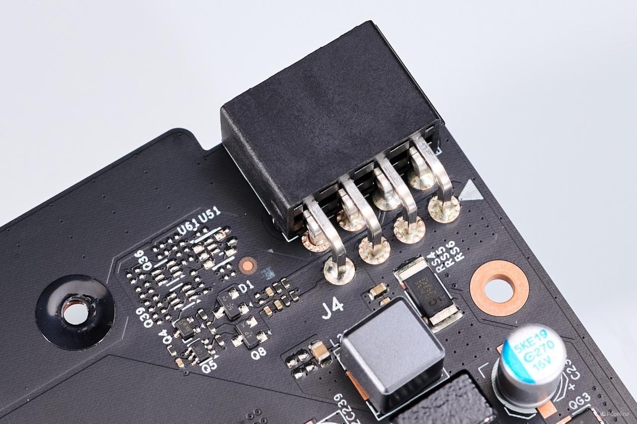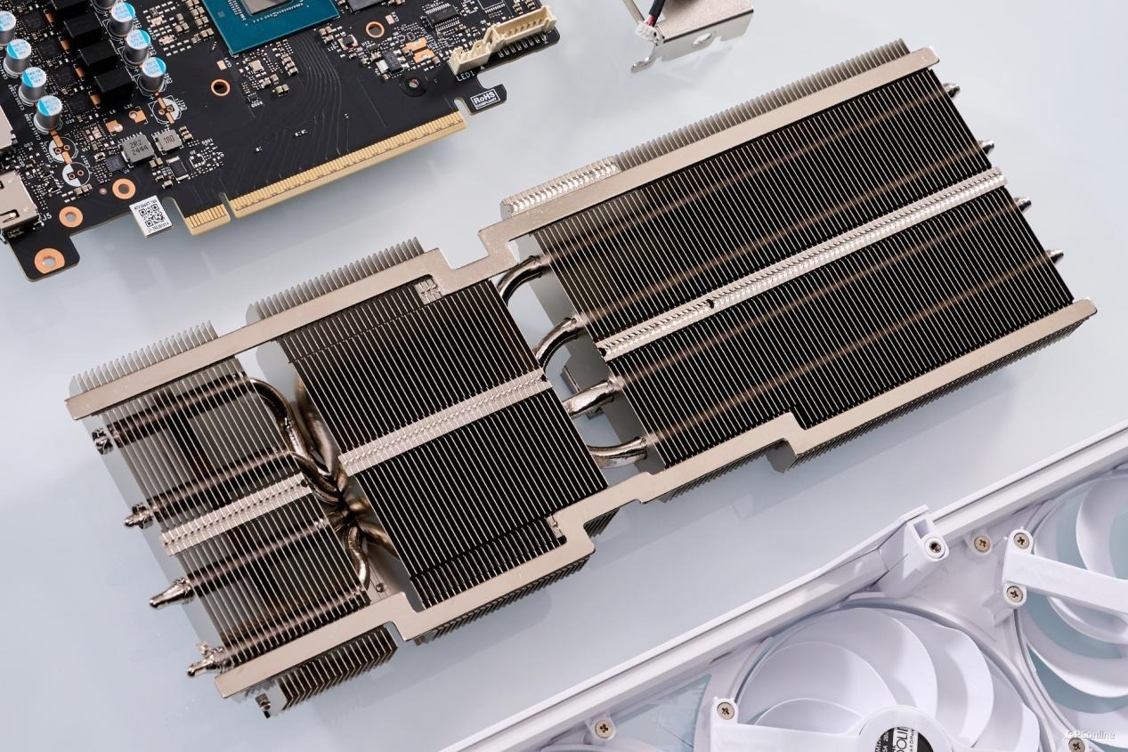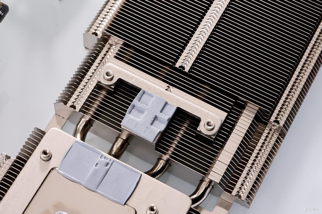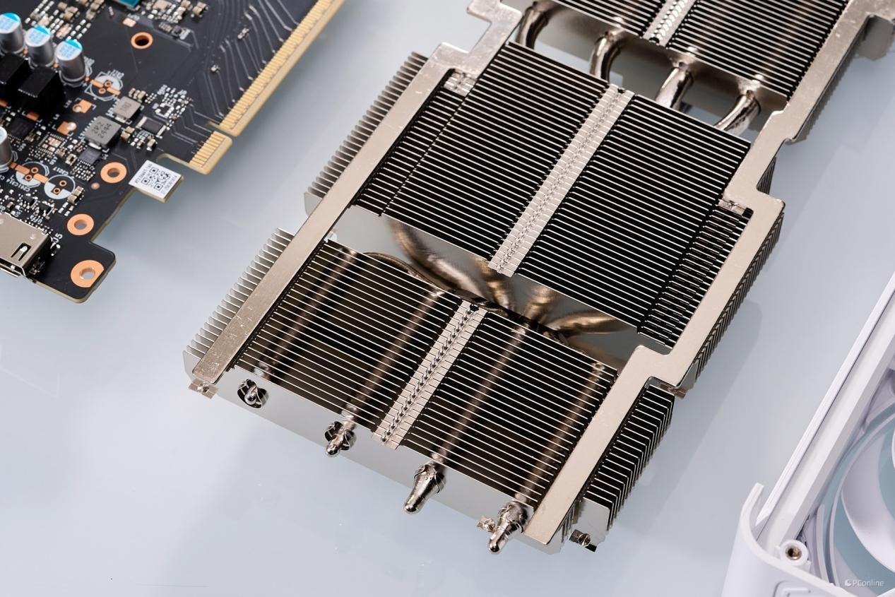 同时 4条6mm热管与鳍片间采用了回流焊接工艺,使得热量传递更为高效,能够快速地将 GPU 核心产生的热量传递到鳍片上。