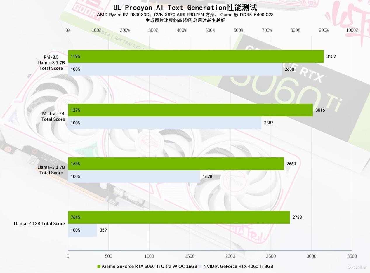 接着我们又用UL Procyon的AI Text Generation测试了更多的大语言模型,iGame RTX 5060 Ti Ultra W OC 16GB的优势依旧十分明显,在以Llama 3.1 7B LLM打造的Phi-3.5测试中,新一代显卡取得3152分的成绩,相比RTX 4060 Ti提升了19%,将参数扩大至13B的Llama 2的测试,iGame RTX 5060 Ti Ultra W OC 16GB也能对答如流,不过RTX 4060 Ti 8GB的显存就显得捉襟见肘了,回答速度极慢,几乎不可用,整体性能被RTX 50系甩在后面,差距有6倍以上。