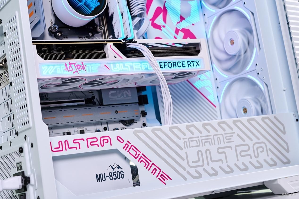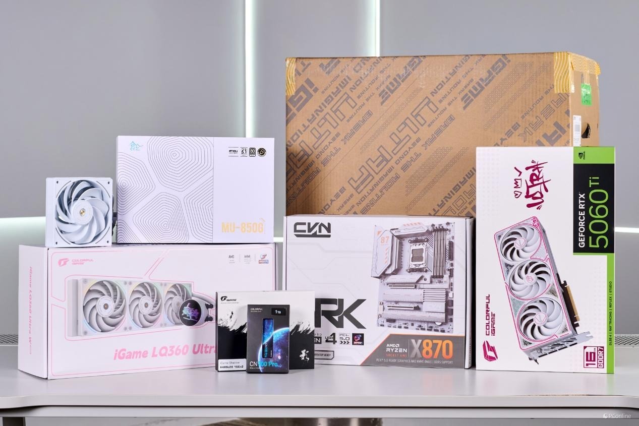 七彩虹全家桶产品,涵盖了包括Ultra家族硬件的iGame GeForce RTX 5060 Ti Ultra W OC 16GB显卡、iGame C25A Ultra W机箱、iGame LQ360 Ultra W 2025一体式水冷散热器、iGame F12025D ARGB Ultra LITE(反叶)风扇和CVN X870 ARK FROZEN 方舟主板、iGame 影 DDR5 6400 C28 16G*2内存条、COLORFUL CN700 Pro 1TB固态硬盘,以及昆仑MU-850G 冰山版电源。整套设备均采用纯白外观设计,因此,本次我们将构建一台以白色为主题的电竞主机。