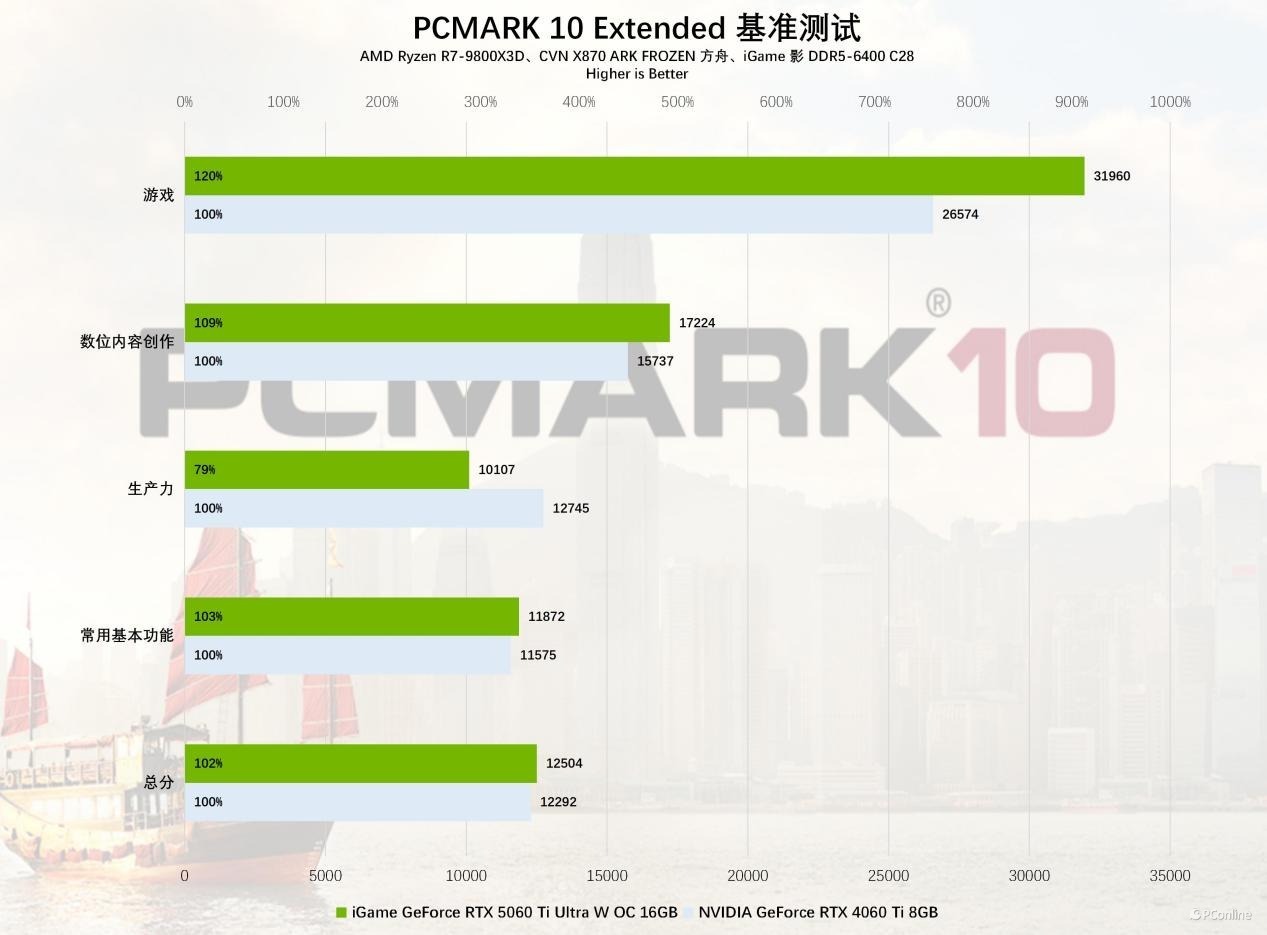 看过了游戏,下面就是专业创作领域的内容了。先给大家伙看一下综合场景的性能表现,在PCMark10 Extended测试,iGame RTX 5060 Ti Ultra W OC 16GB在游戏、数位内容创作方面的表现更佳,基本上要比RTX 4060 Ti高9%~20%左右,而生产力方面的成绩则比较低,推测是目前驱动还不完善所致。