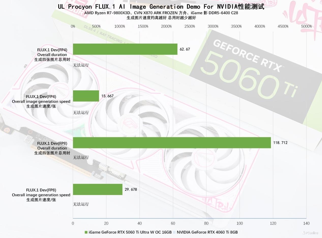 首先我们用UL Procyon的FLUX.1 AI Image Generation Demo For NVIDIA进行测试。在FP8精度模型测试时,iGame RTX 5060 Ti Ultra W OC 16GB能够做到29.678s生成一张图,而RTX 4060 Ti可能是由于显存的原因,无法完成测试;而切换到FP4精度模型后,iGame RTX 5060 Ti Ultra W OC 16GB的速度有了比较大的进步,生成图片的速度能够做到15.667s一张,效率直接翻倍。而RTX 4060 Ti依旧无法运行,这已经不是快慢的问题了,因此喜欢AI的玩家真的要认真考虑一下,更大显存的iGame RTX 5060 Ti Ultra W OC 16GB才是决定AI的胜负手。