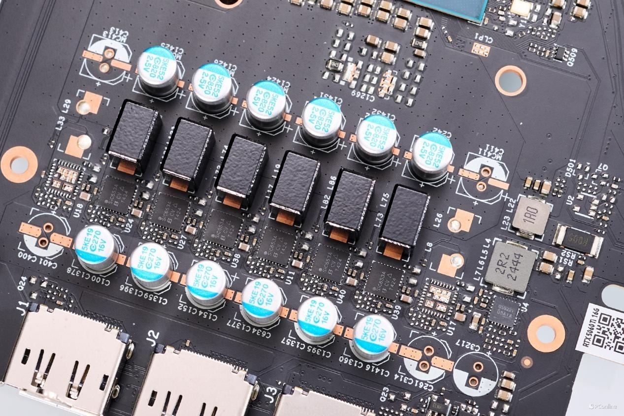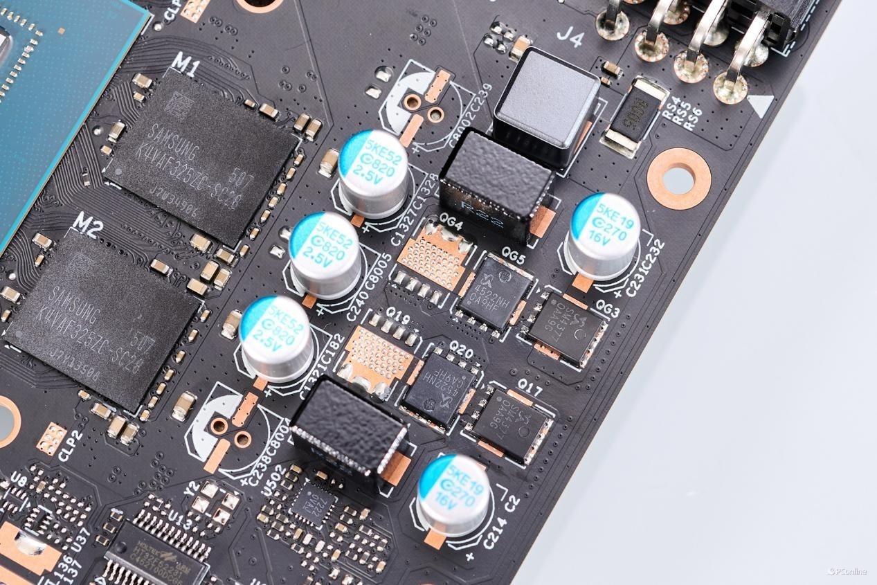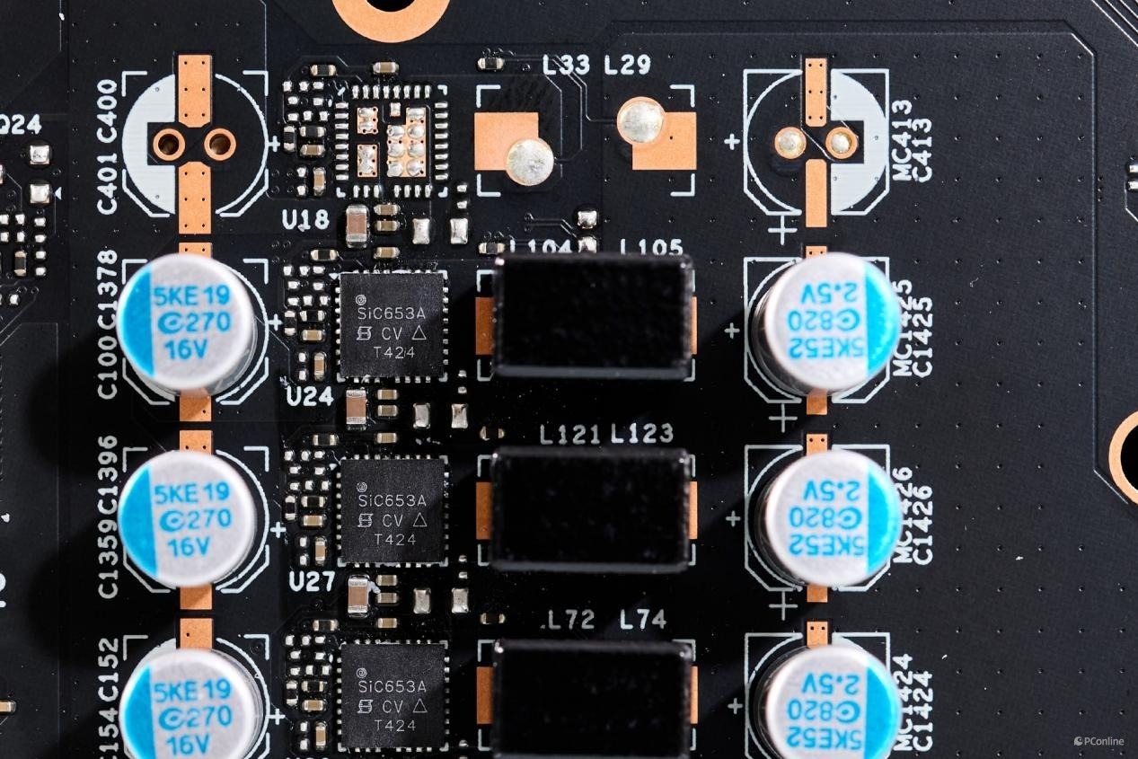 6相核心供电,每相供电均配上了固态电容、全封闭电感,以及DrMos芯片;同时仍有两路空焊,预留给更高规格的显卡。