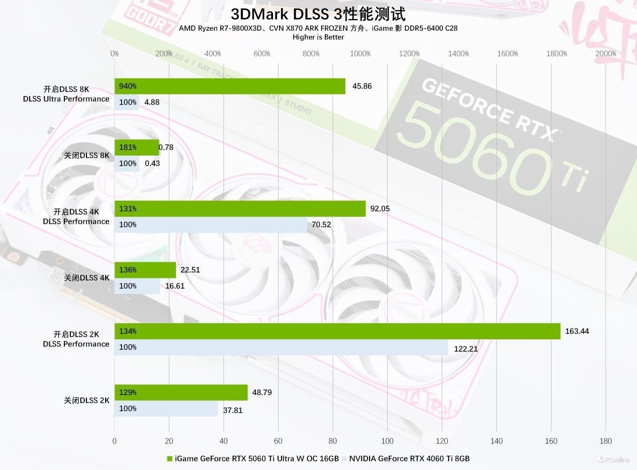 一如既往,我们首先进行了3DMark的DLSS 3性能测试。在2K分辨率下,iGame RTX 5060 Ti Ultra W OC 16GB相较于RTX 4060 Ti,性能提升了大约34%。而在4K分辨率下,启用DLSS 3后,性能领先幅度也基本保持在31%。考虑到两款显卡的CUDA核心数量仅相差约5%,可以肯定的是,NVIDIA的Blackwell架构确实带来了显著的性能提升。