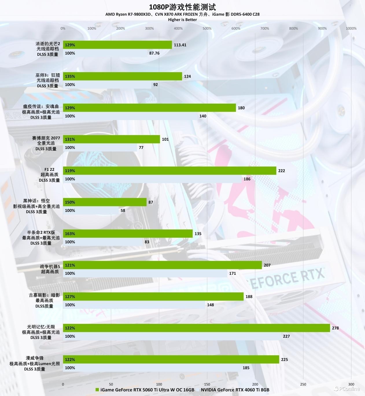 在1080P分辨率的实测中,iGame RTX 5060 Ti Ultra W OC 16GB轻松应对了大多数游戏,其性能甚至允许它在2K分辨率下流畅运行大部分3A级游戏。根据测试数据,在一些优化良好的游戏中,例如《F1 22》和《光明记忆:无限》,这款显卡能够轻松达到200+ FPS,接近300 FPS的水平;即便是在硬件要求极高的游戏中,如全高设置的《黑神话:悟空》,它也能够提供87 FPS的流畅体验,而《赛博朋克2077》更是能保持在百帧以上。综上所述,iGame RTX 5060 Ti Ultra W OC 16GB在畅玩3A级游戏方面毫无问题,其性能相较于RTX 4060 Ti提升了大约20%~30%。