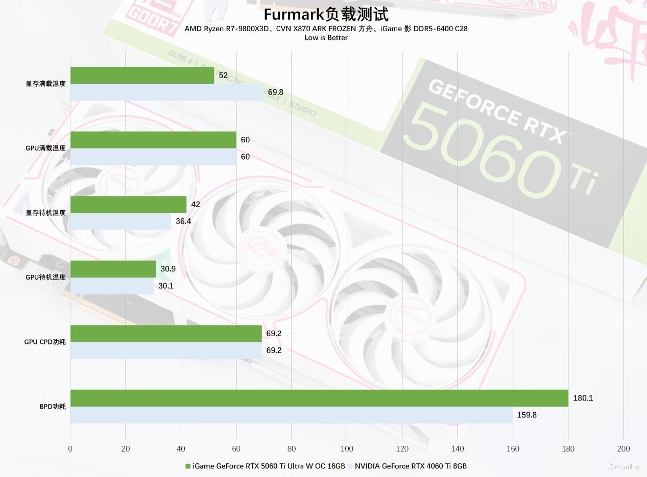与RTX 4060 Ti进行横向对比后可以发现,尽管新显卡的TDP有所提升,但其烤机功耗依然保持在合理范围内。特别是iGame RTX 5060 Ti Ultra W OC 16GB显卡,凭借其三风扇设计、镀镍铜底座以及大面积散热鳍片等高端配置,整体散热效果极为出色,部分温度甚至低于150W的RTX 4060 Ti,这无疑是一个令人惊喜的结果。