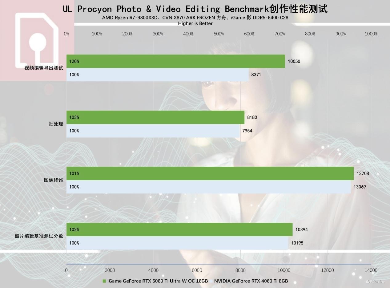 转而关注图像编辑与视频创作的性能,UL Procyon的测试结果显示,两款显卡在图像编辑方面的性能差距微乎其微,大约只有2%。然而,在视频剪辑方面,iGame RTX 5060 Ti Ultra W OC 16GB的优势则较为明显,达到了20%。