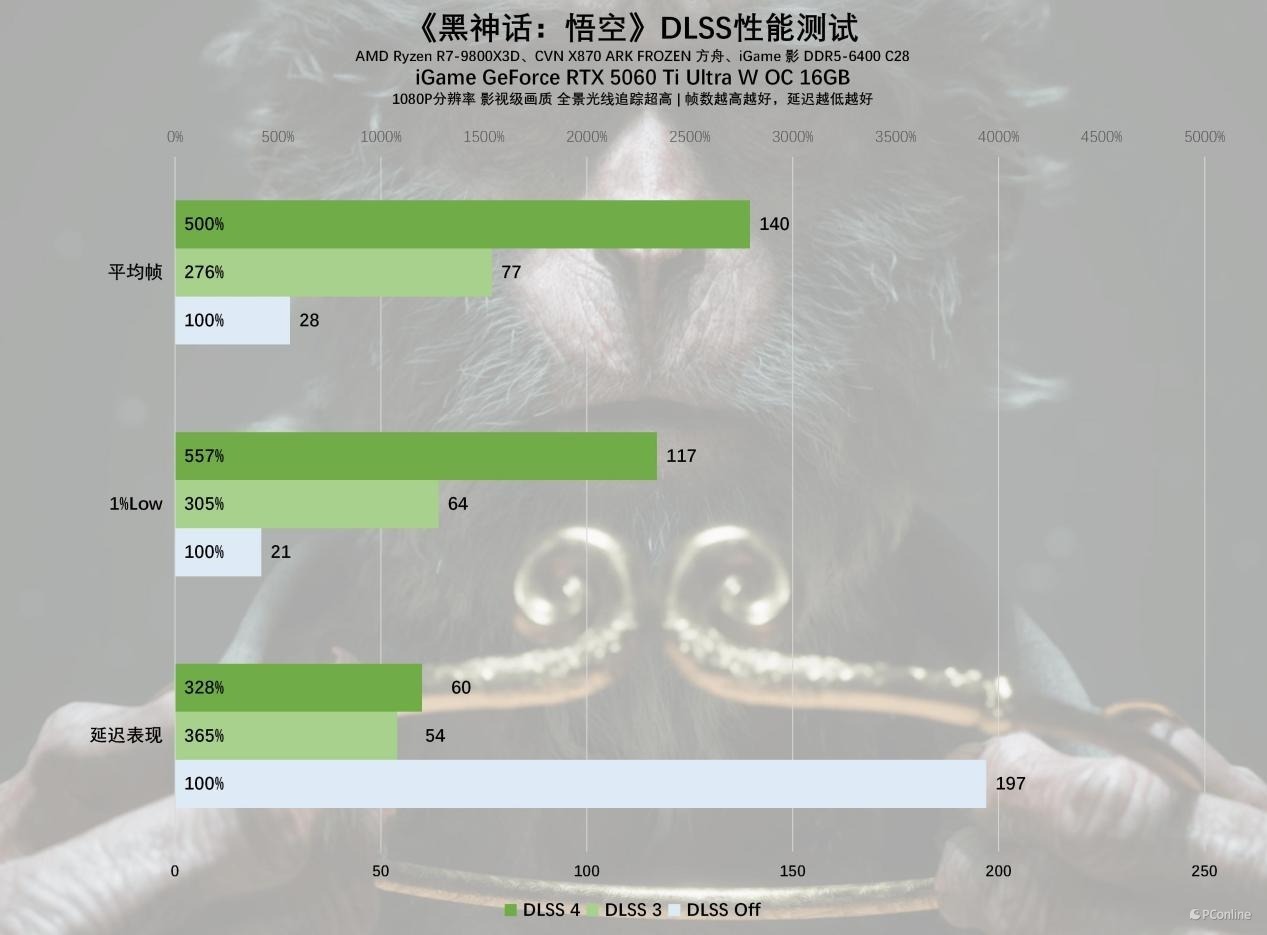 在实际测试中,我们注意到《霍格沃兹之遗》这款游戏的优化相当出色。在1080P分辨率下,将画质和光线追踪效果均调至最高,iGame RTX 5060 Ti Ultra W OC 16GB显卡在不启用任何超采样技术的情况下,平均帧率可达71 FPS。当启用DLSS 3的质量模式后,帧率可提升至123 FPS,实现了高刷新率与卓越画质的完美平衡,游戏体验极为流畅。进一步开启DLSS 4,帧率更是可以提升至218 FPS,相较于原生1080P分辨率,性能提升了超过三倍。在游戏过程中,无论是1% Low帧数还是延迟表现都相当优秀,特别是延迟,比原生分辨率还要低,提供了更佳的操控感。