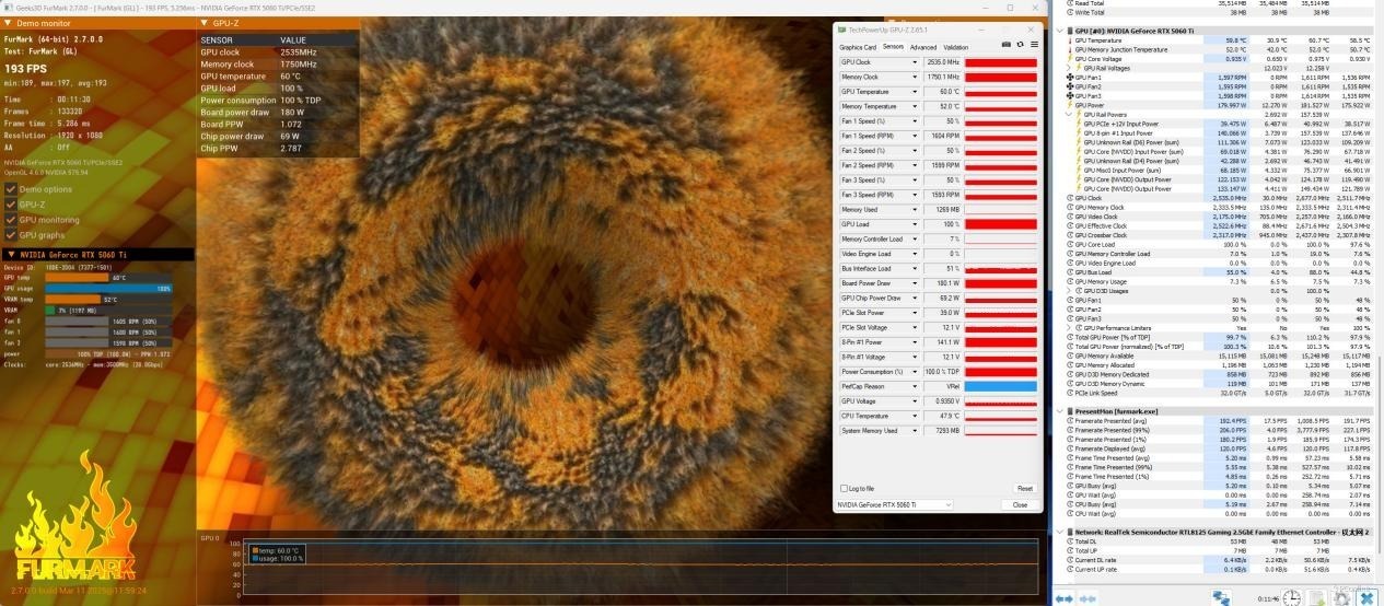 最后一项测试是烤机环节,这通常是众多玩家关注的焦点。得益于iGame RTX 5060 Ti Ultra W OC 16GB显卡卓越的散热设计,其整体性能表现令人印象深刻。在20℃的室温下,经过Furmark烤机测试10分钟后,显卡的温度保持在较低水平,核心温度仅为60度,显存温度更是低至52度。此时显卡的最大功率达到了180W,恰好处于TDP的上限,而风扇转速为1600RPM,真正实现了高效散热与低噪音的完美平衡。